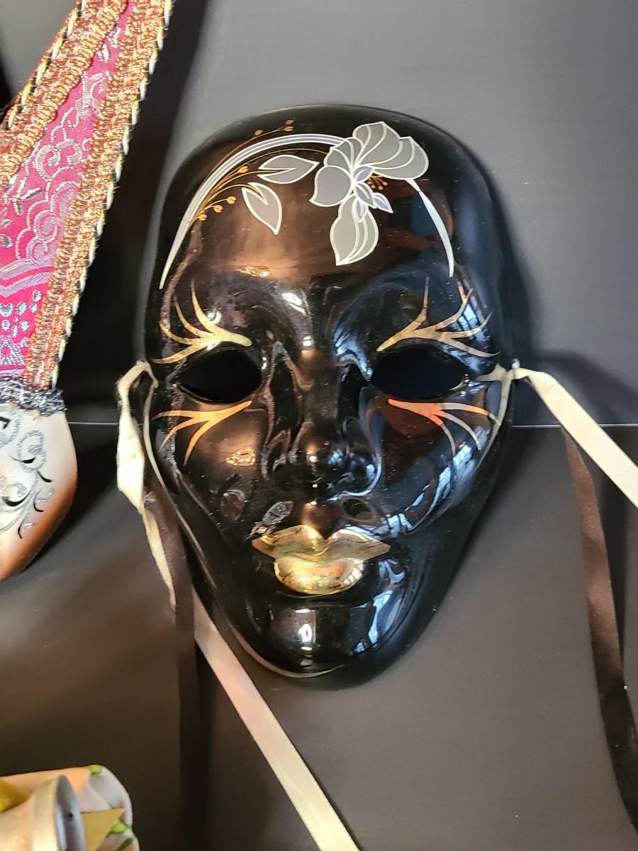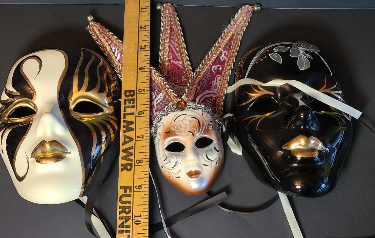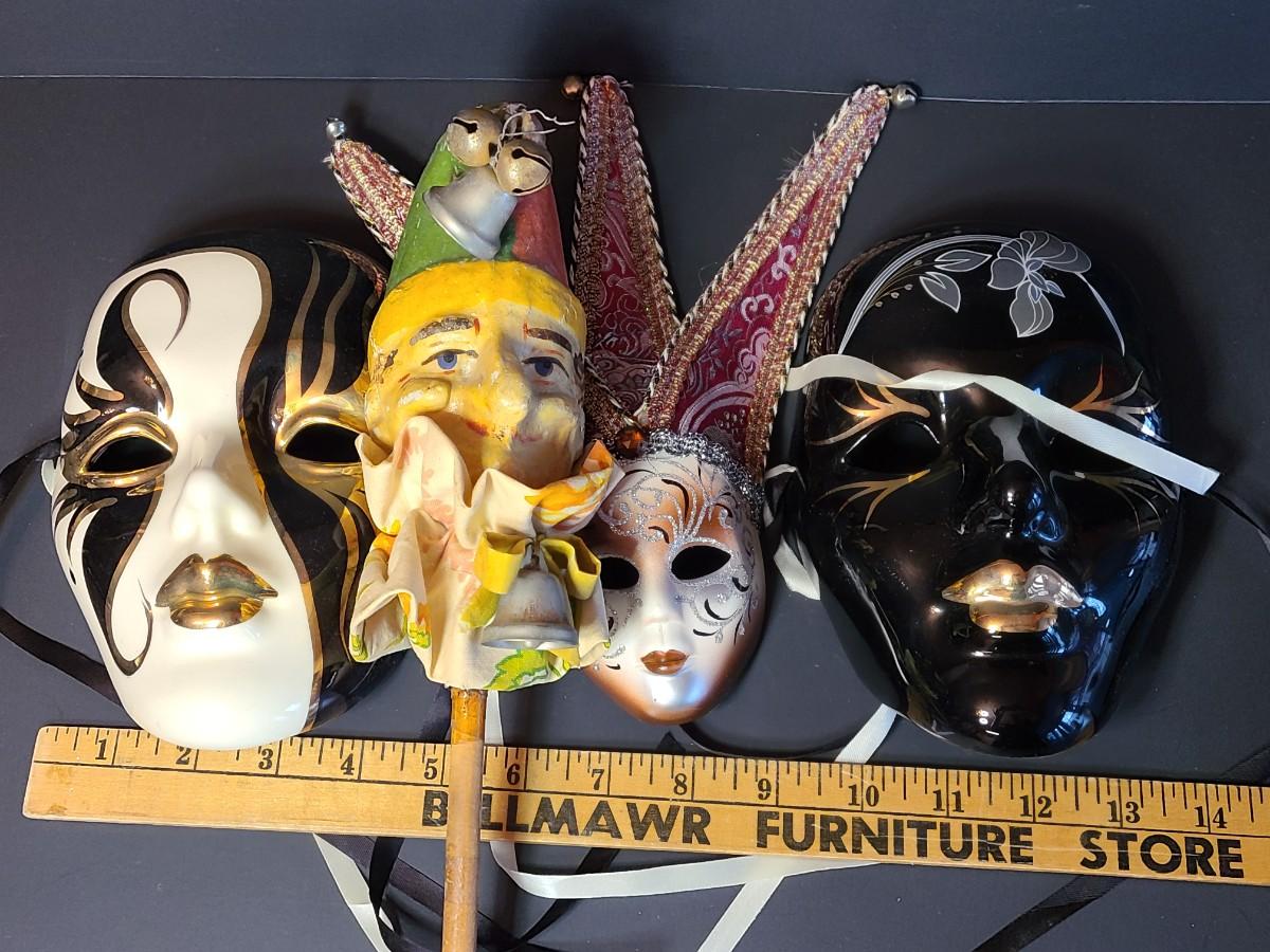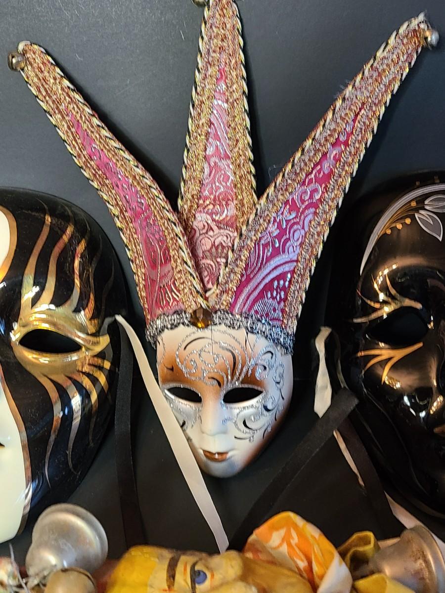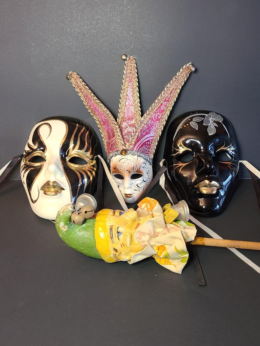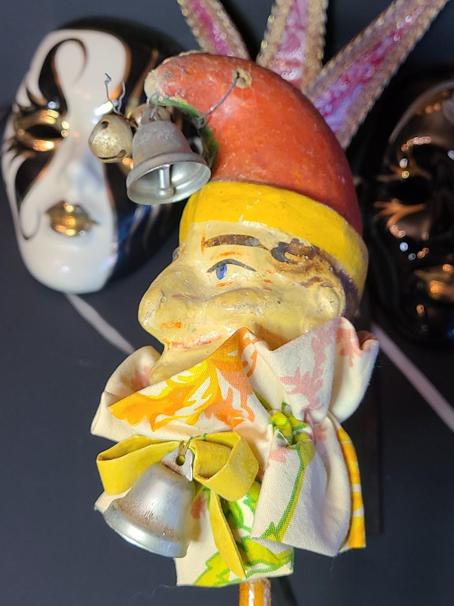 Handmade ceramic face masks used as decor, smaller purple mask for decor, and vintage/antique cardboard/paper mache parade jester stick.