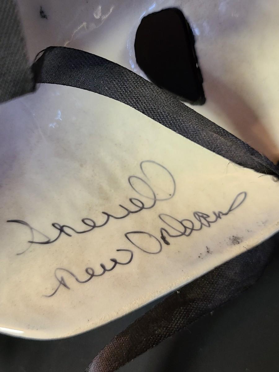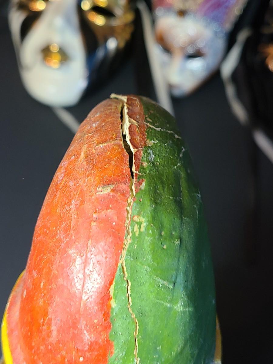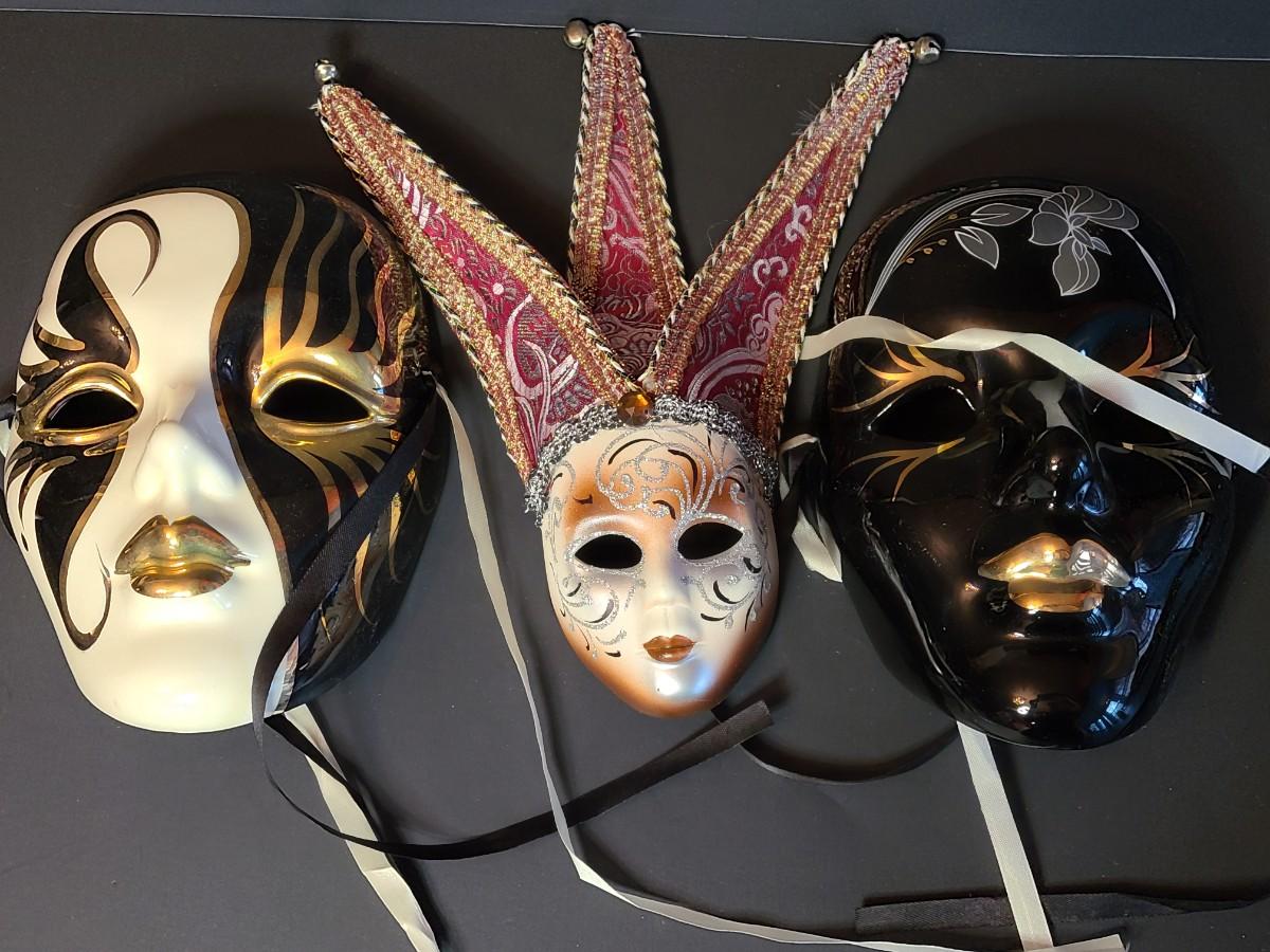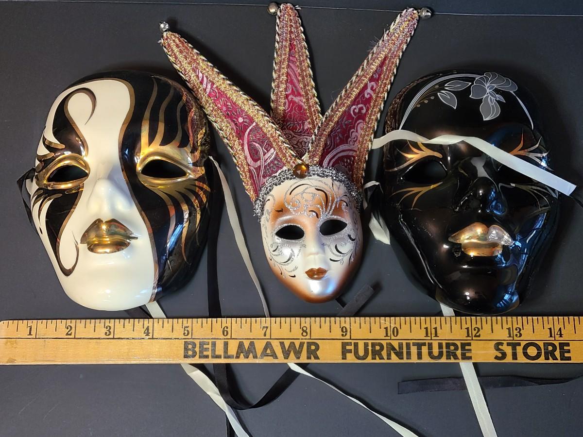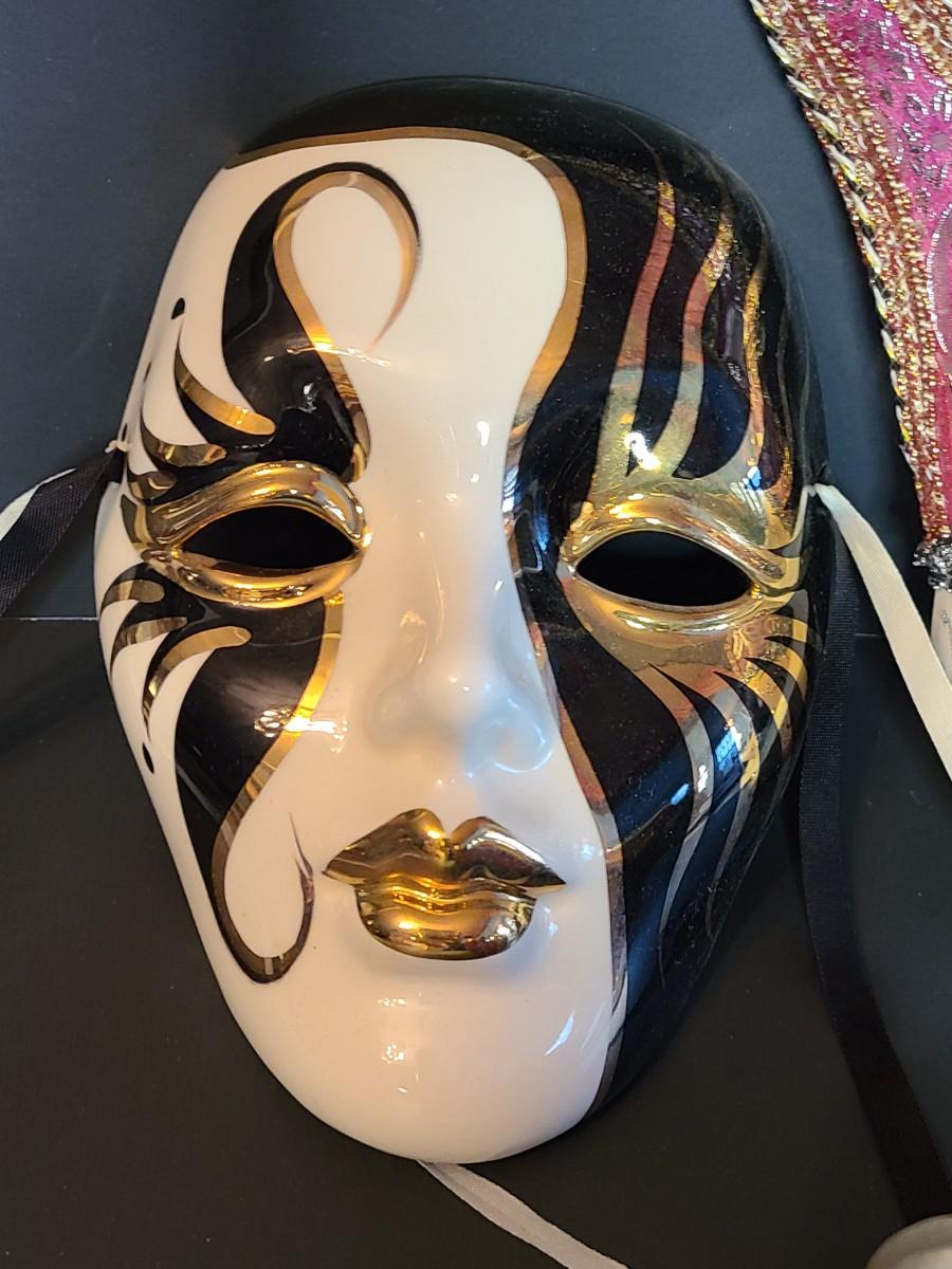 Handmade ceramic face masks used as decor, smaller purple mask for decor, and vintage/antique cardboard/paper mache parade jester stick.