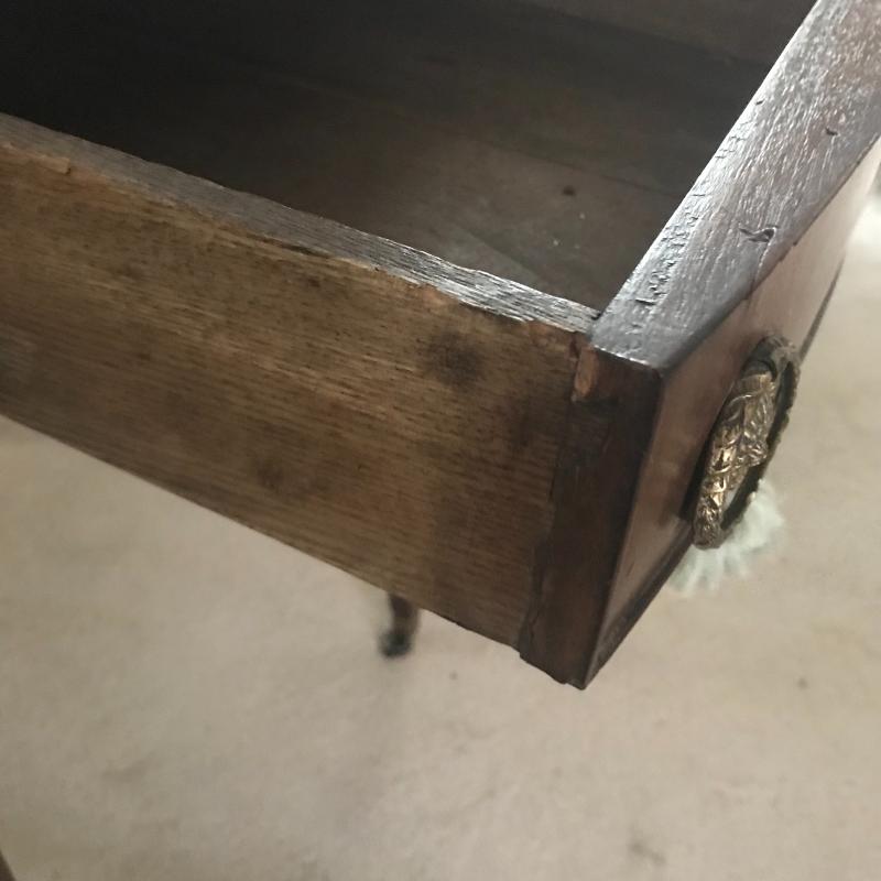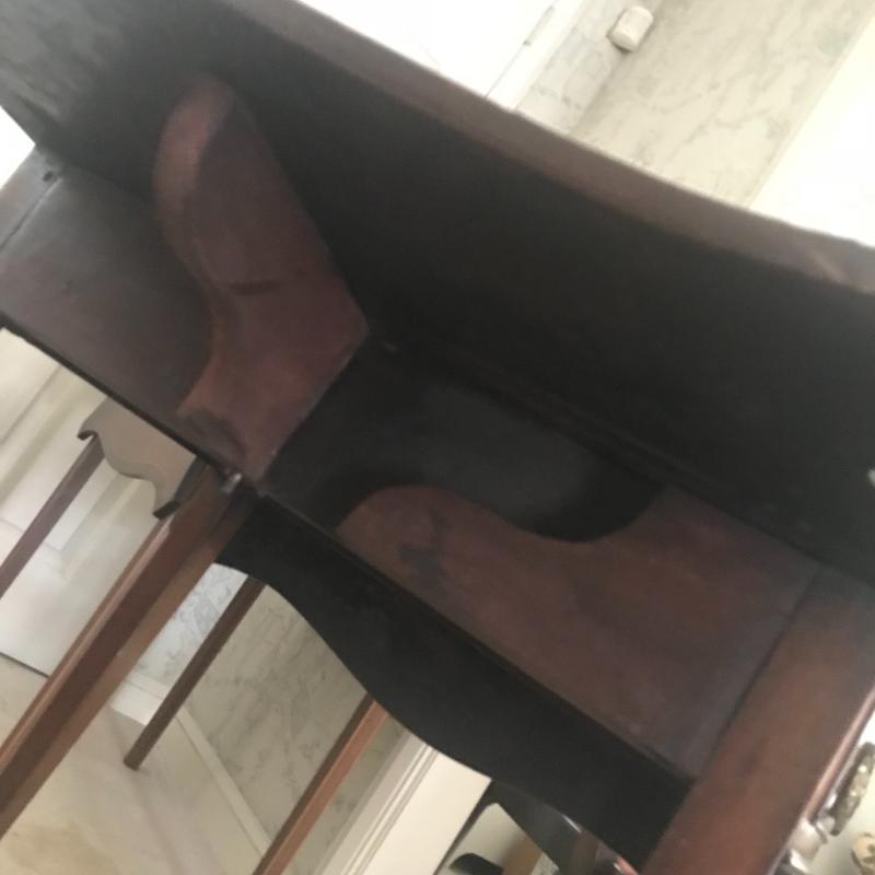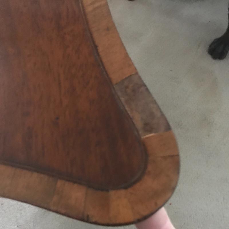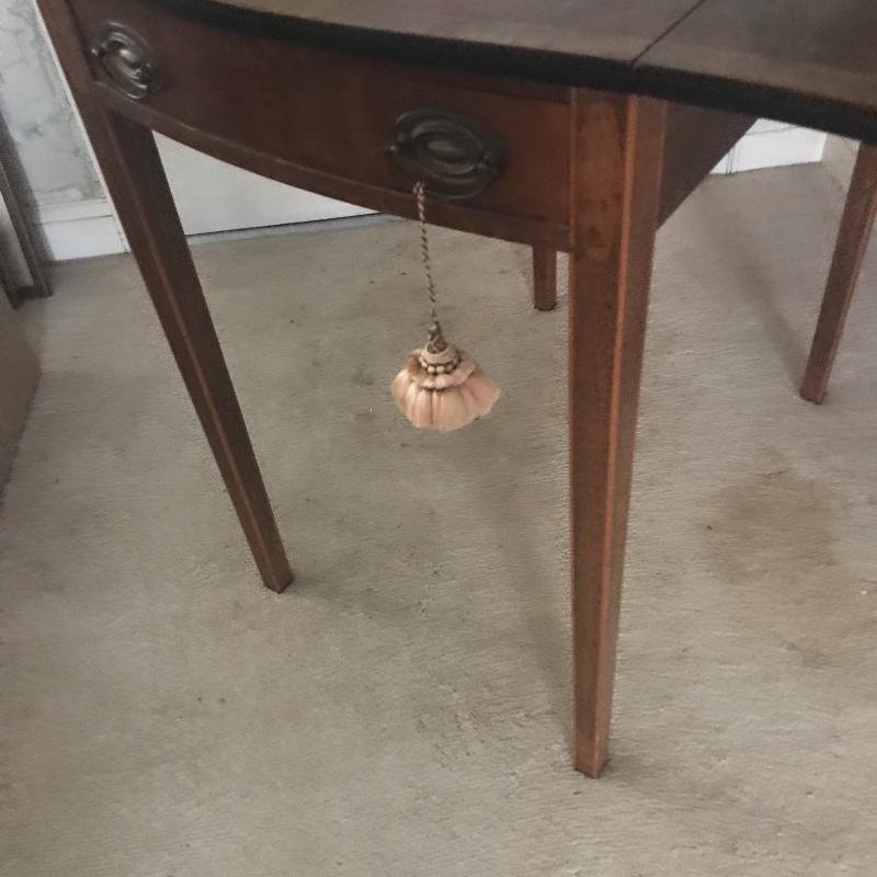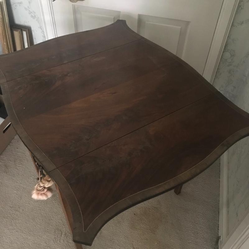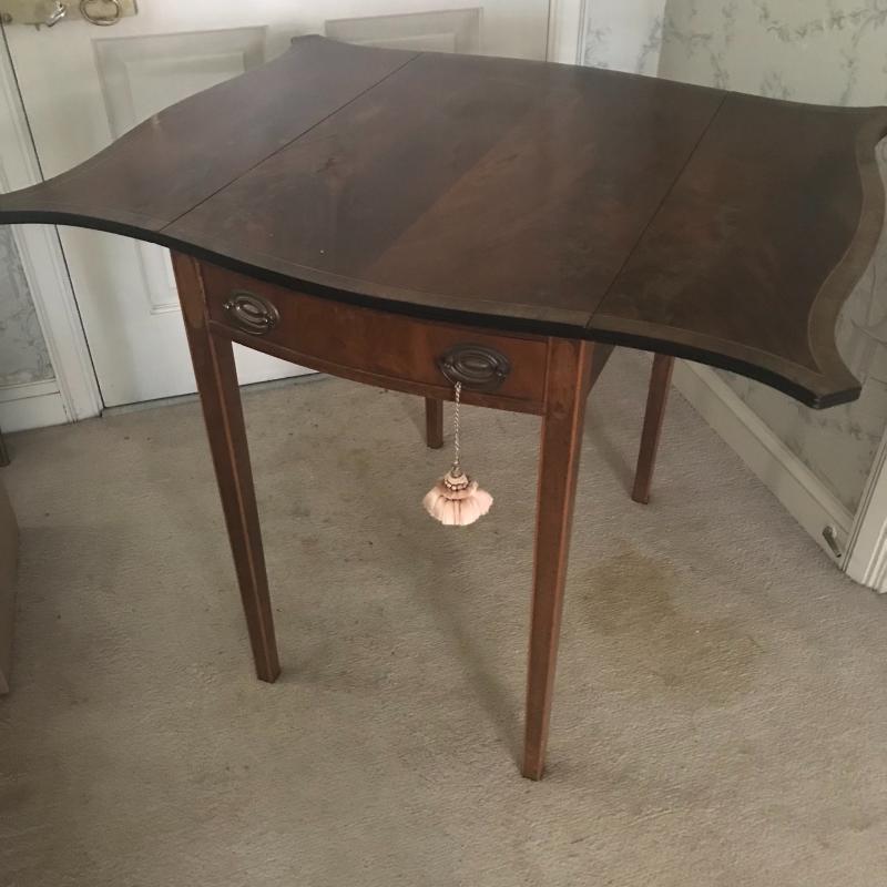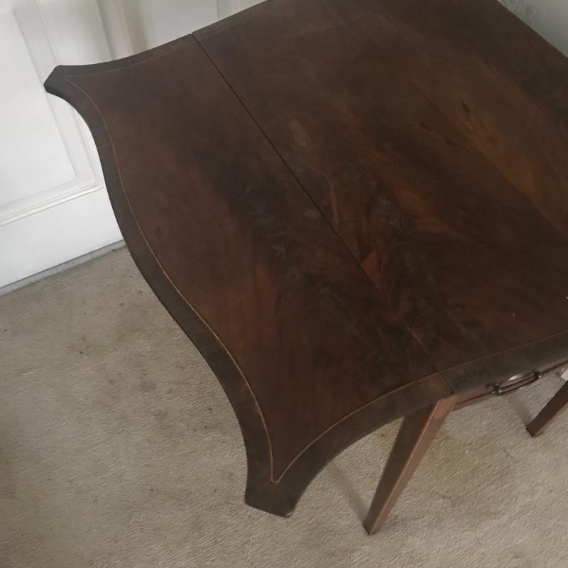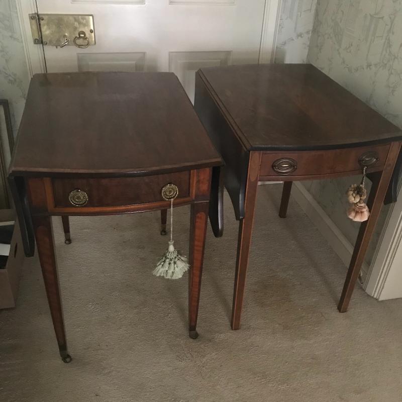 Beautiful antique tables that go well together but are not matching. One has softer curves in drop leaves, caster wheels and measures 20” x 29.5” x 28.5”. When open it is 38” wide. Has a few chips in the inlay on the leaves. The other has straighter edges and measures 20” x 28” x 28.5” (36” when open). This one has a couple of scuffs on the top. Local pick up only.