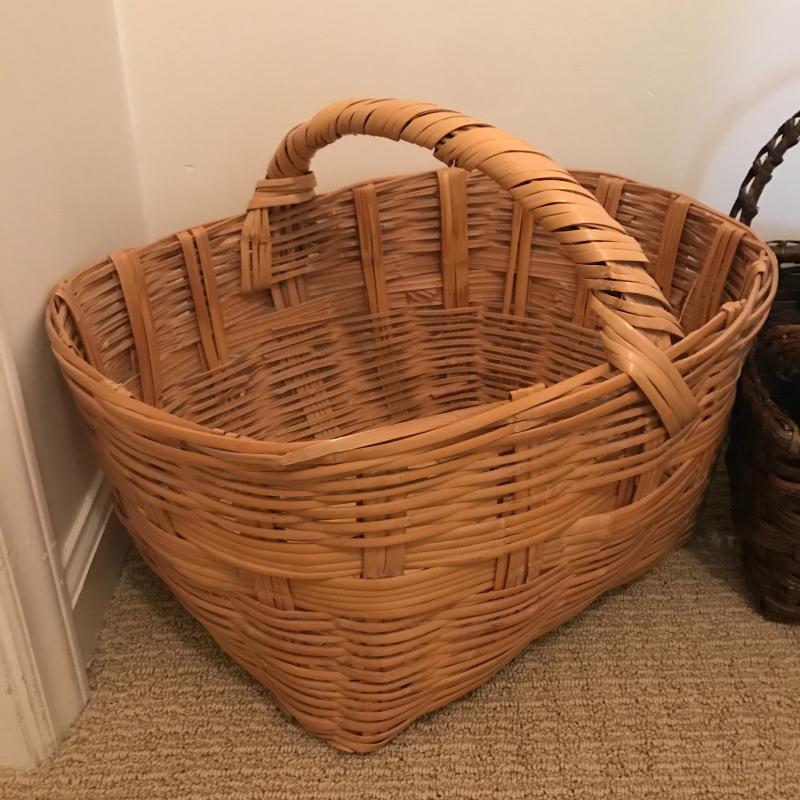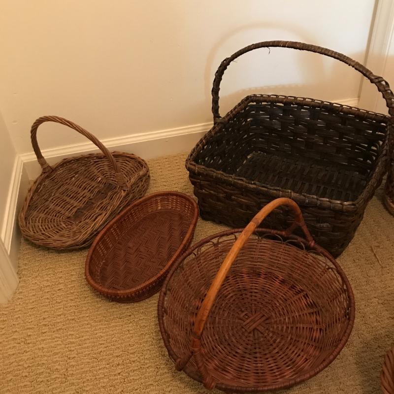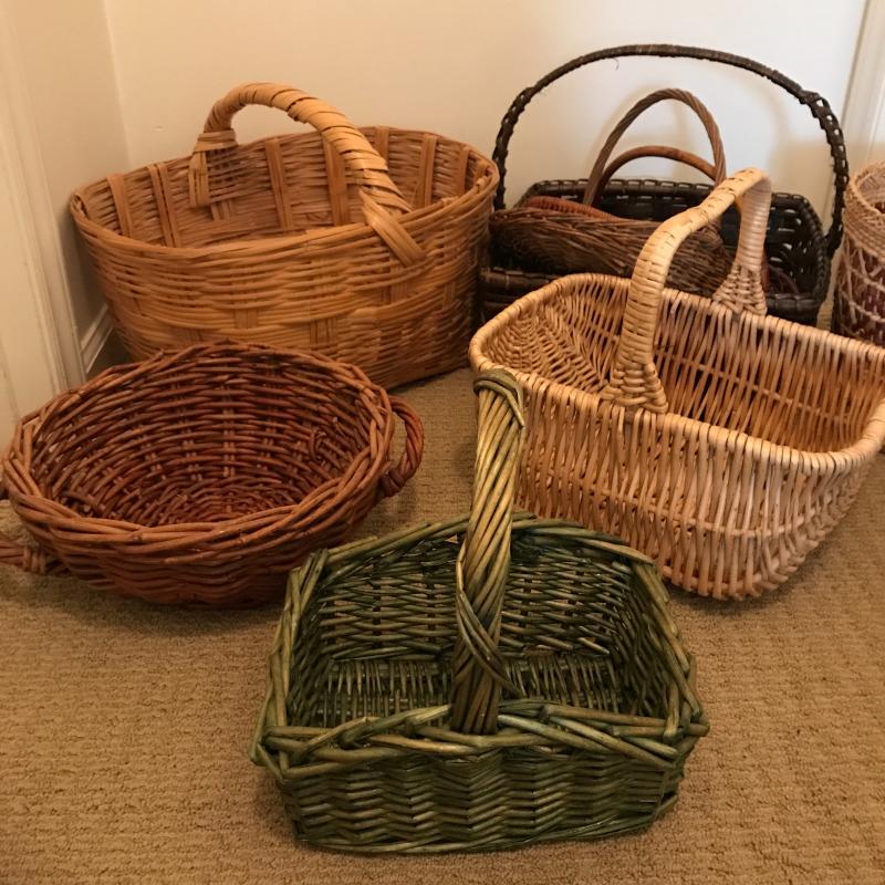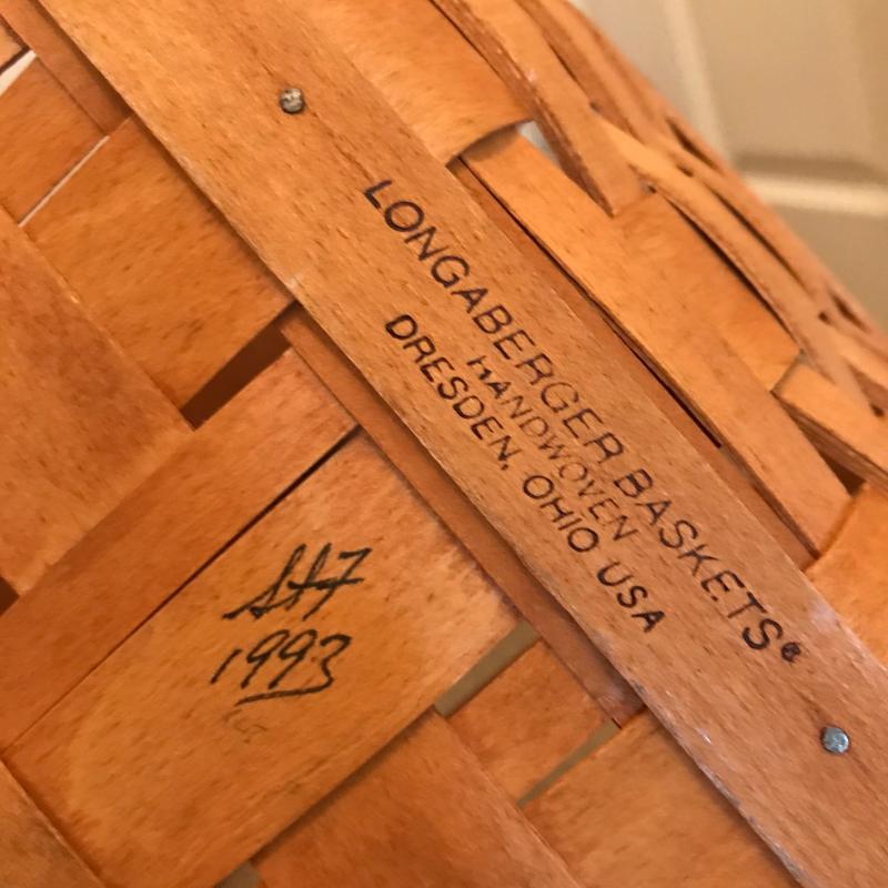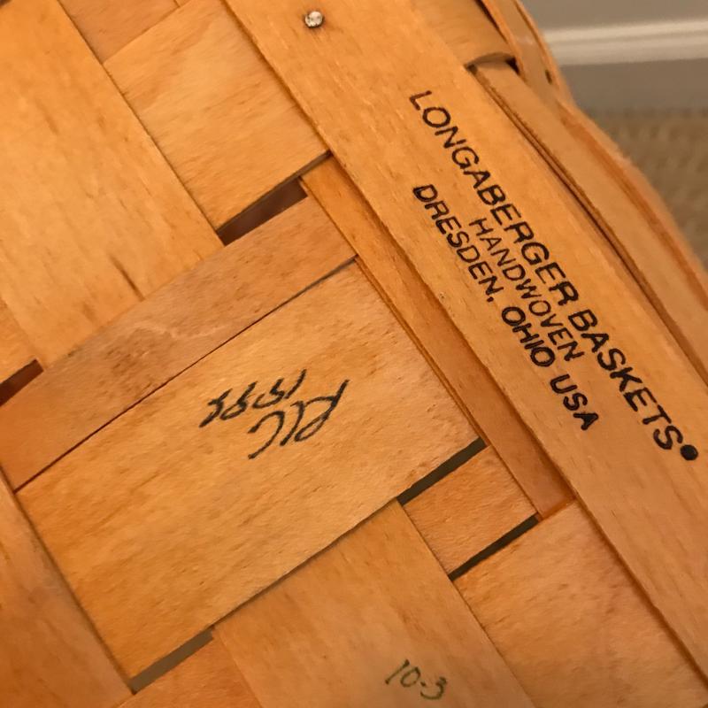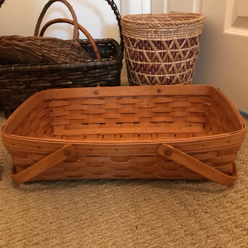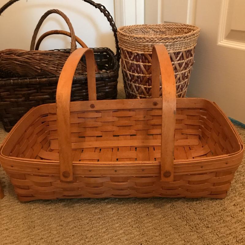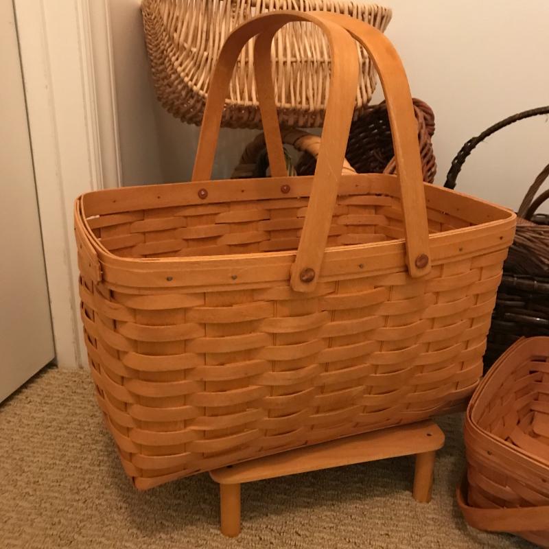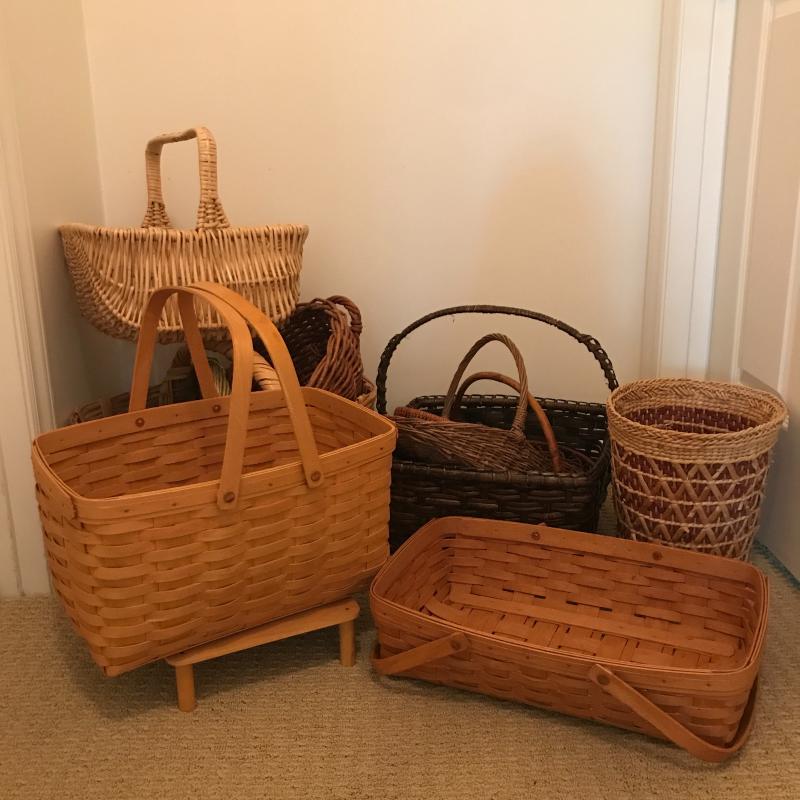 Two large size and excellent condition signed Longaberger baskets. Largest measures 16” x 12” x 9”h. Several other baskets in various sizes included. Small display stand included. No shipping. Local pick up only.