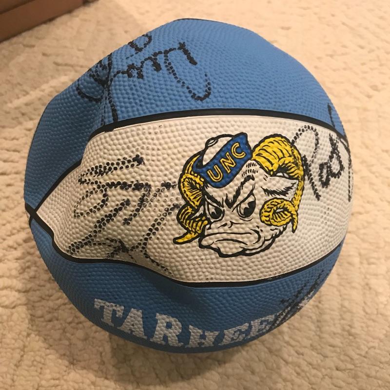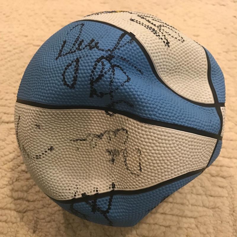 Big4 blue and white UNC signed basketball from presumably the 1992-1993 season based on player names and timing of when they played. Some signatures appear to be Dante Calabria, Pat Sullivan, Matt Wenstrom, Eric Monroe’s, Travis Stevenson and more! Ball needs inflation, see photos. No COA. Shipping available.
