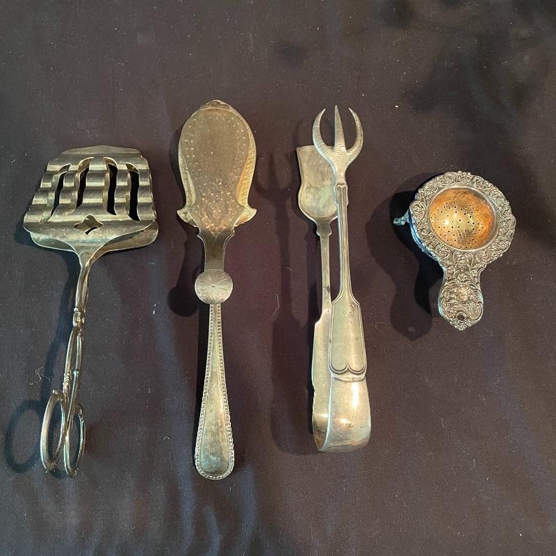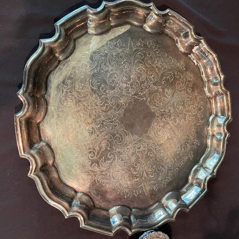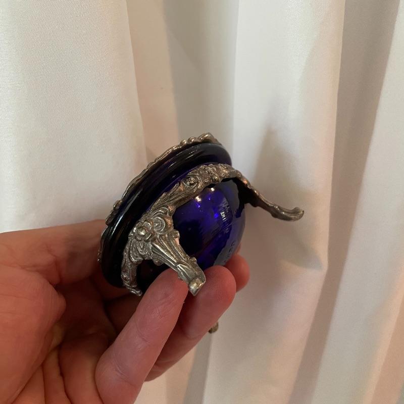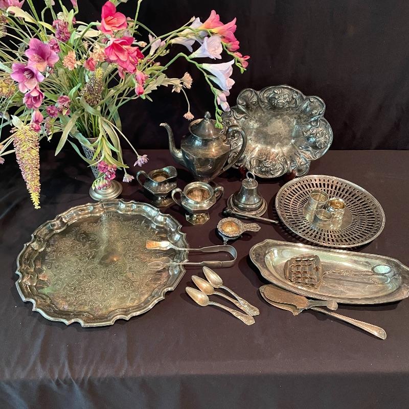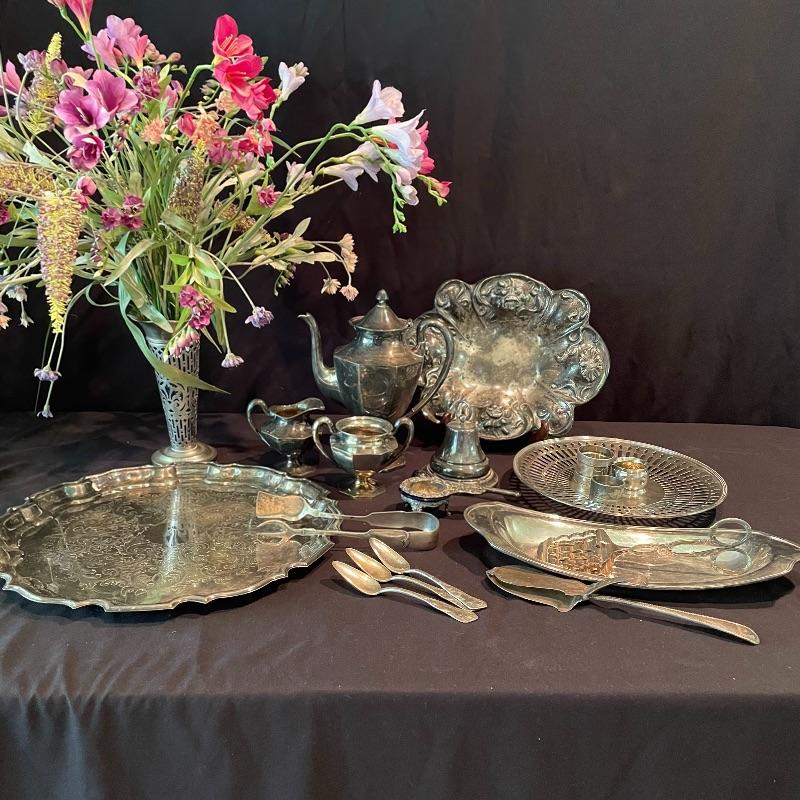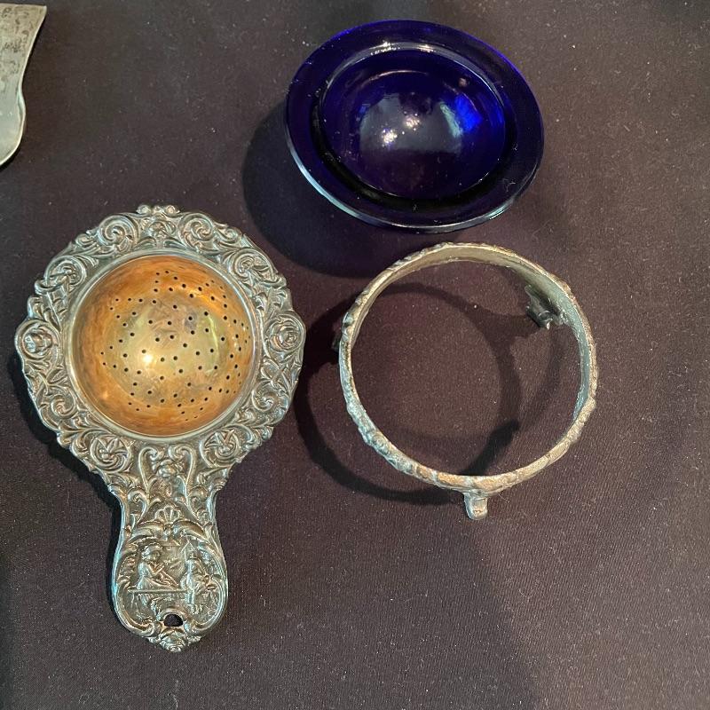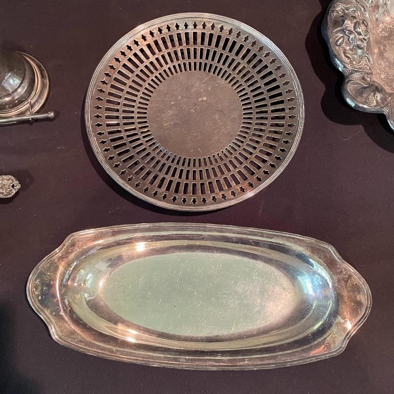 Here’s some items to have your guests chatting about at your next dinner party. Serve up asparagus with its “proper” utensil! Lot include neat citrus adorned spoons, a unique bird claw tong, three napkin holders with plates, trays, tea and more! The Godinger vase is about 8” tall with a deep blue glass insert. It matches perfectly with the other blue glass insert on the piece marked Germany. There is also a heavy weighted bell with knocker, it has a wonderful ring, although there appears to be some rusting on the bottom. Have fun with this shiny silver colored lot! Local pick up only.