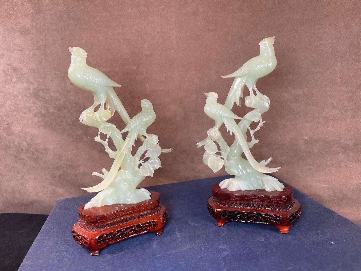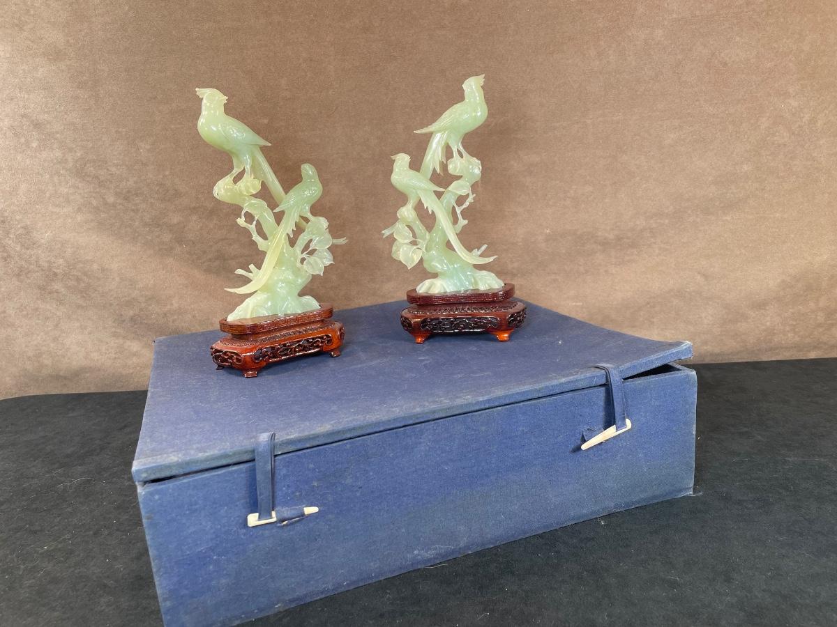 Pair of hand-carved jade figures depicting birds. 9" tall Includes decorative wooden bases and storage box