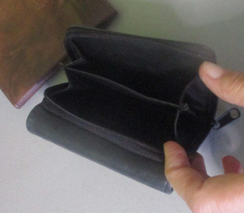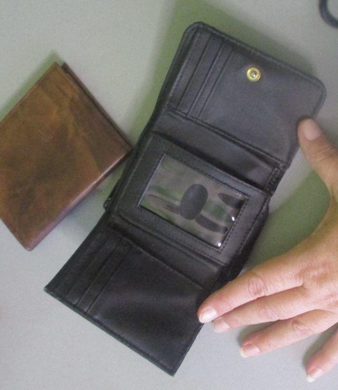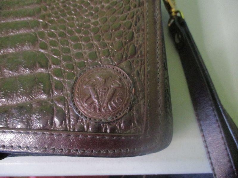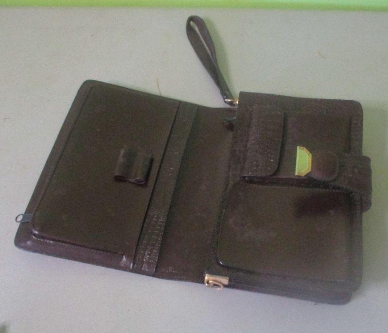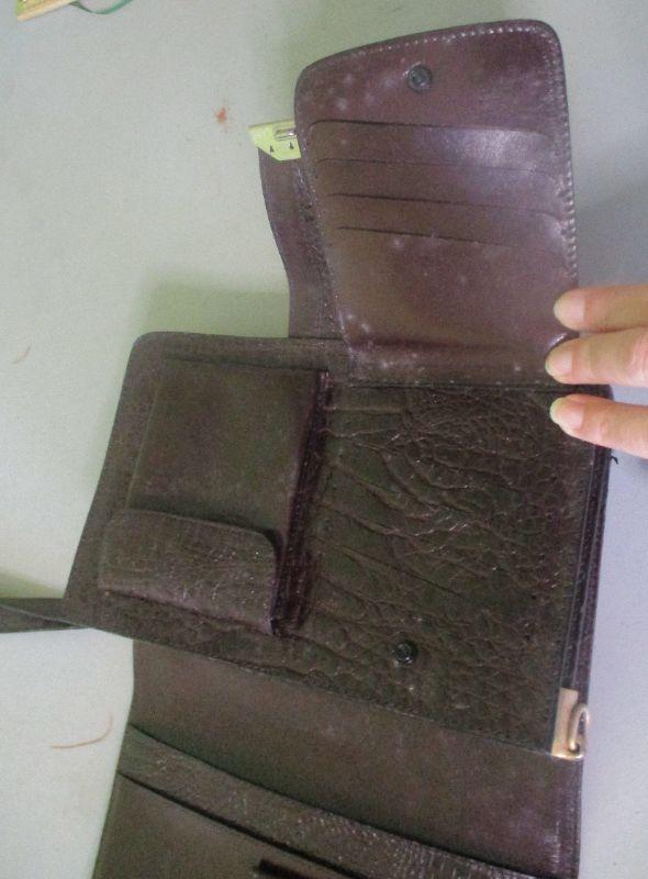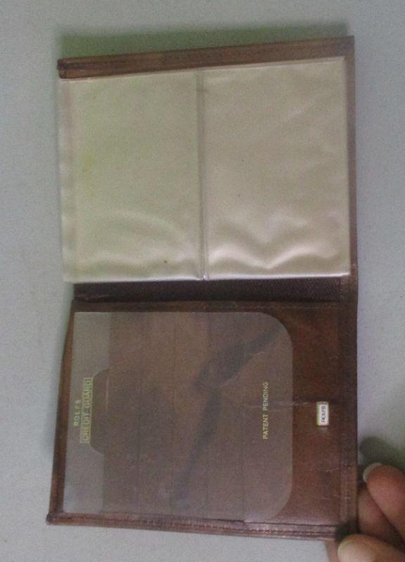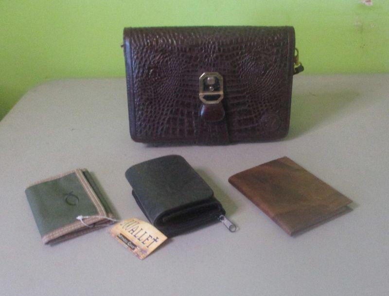 The brown cowhide credit card holder is by Rolfs. The purse doesn't have a maker, but it is stamped "Vitello" and does say that it was made in Columbia. My Google research couldn't find a company with Vitello as a name, but it is the leather used in a lot of high end purses (like Prada). It just needs a light cleaning. None of the items look like they were ever used.