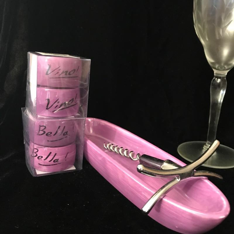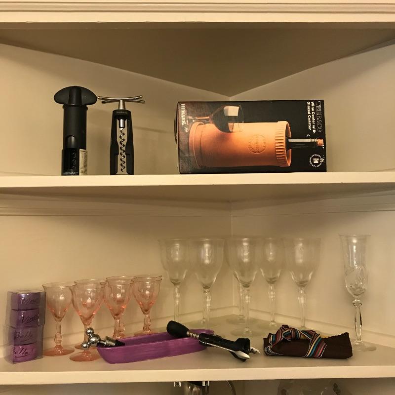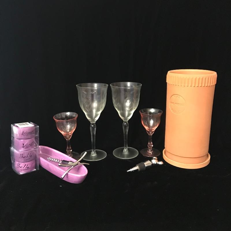Wine lovers unite! Seven lovely etched wine glasses with seven blush colored cordial stemware and one beautiful champagne flute. Lot also features Disney’s Mickey wine stop, four Italian napkin holders with olive dish. For your opening pleasure, we’ve included a variety of openers including a travel opener with bag and a classy Brookstone opener. Keep your bottle at optimal temperature with a like-new terra-cotta bottle cooler. See images. Local pick up only.