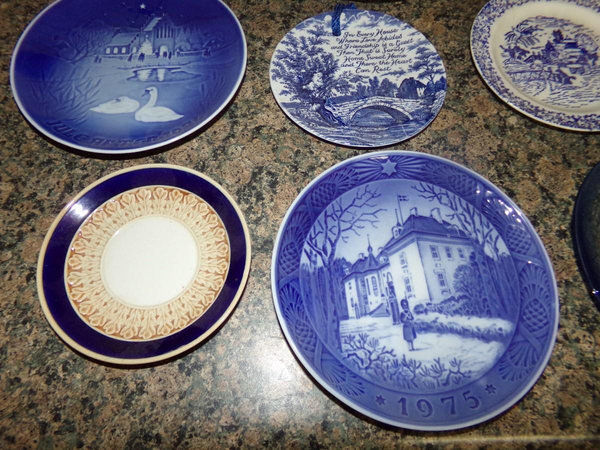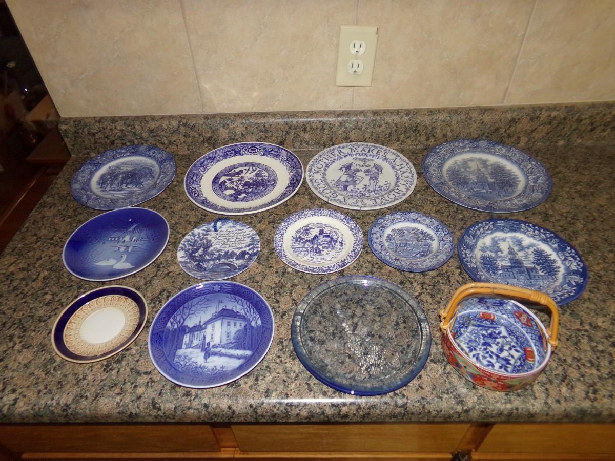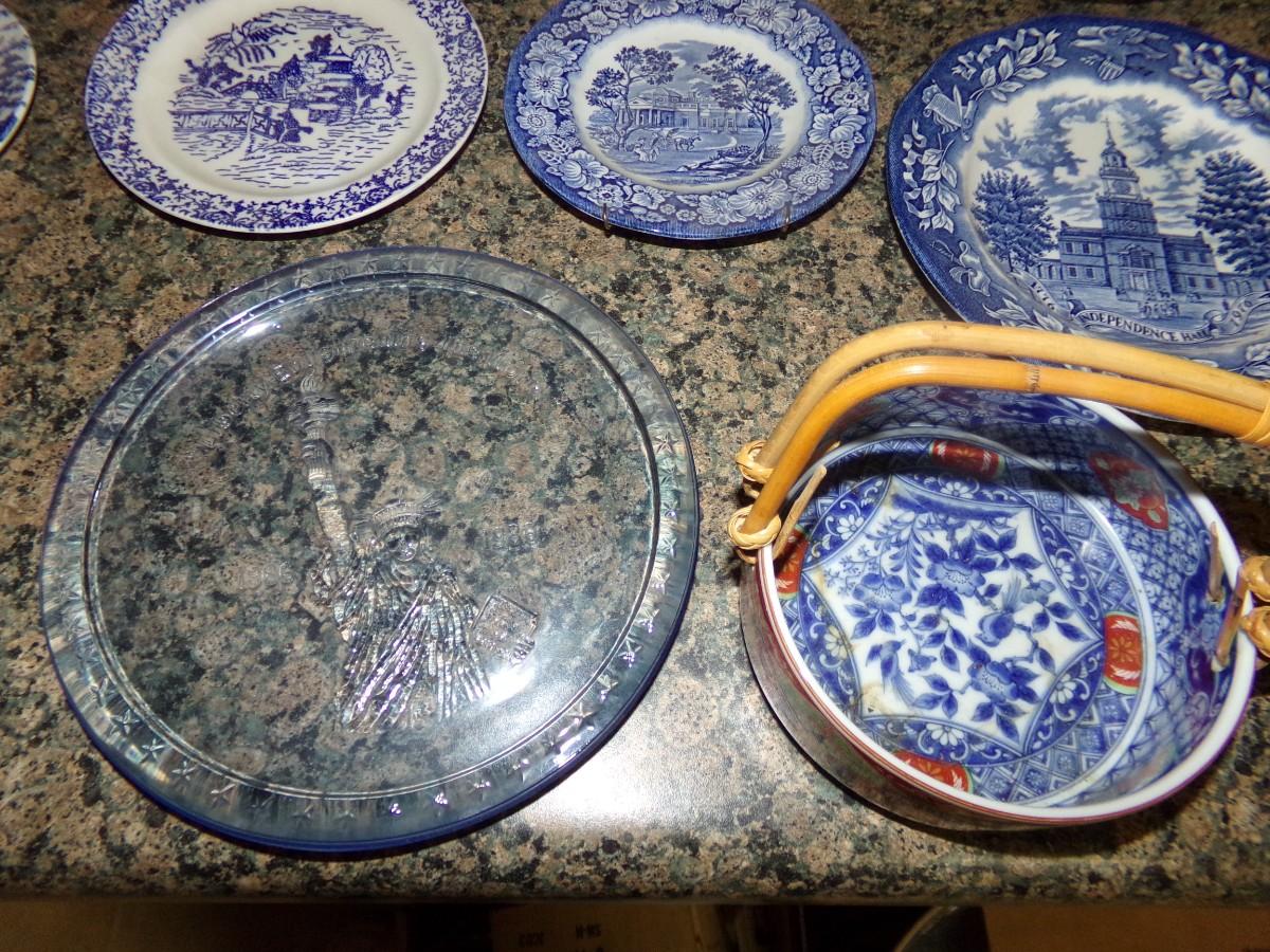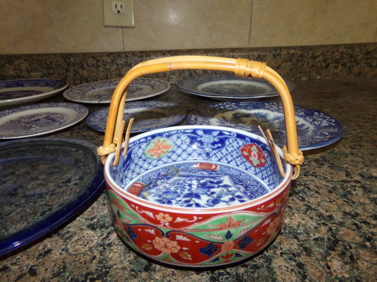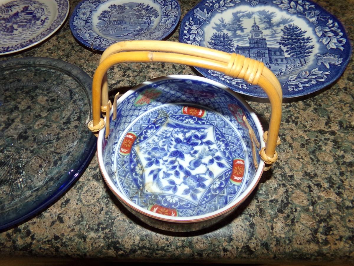 ASSORTMENT OF COLLECTOR'S PLATES, MOST ARE BLUE & WHITE PATTERNED. BEAUTIFUL COLORED BOWL WITH WICKER HANDLE.