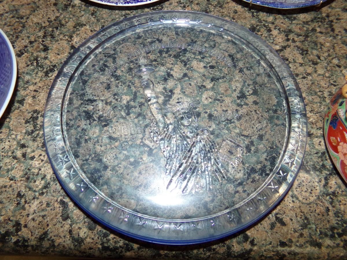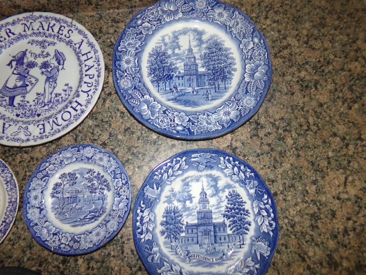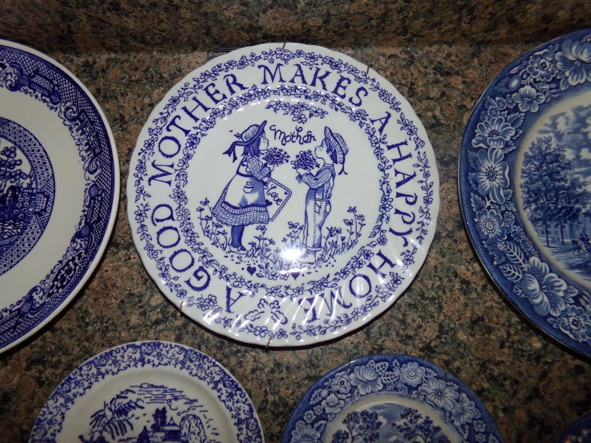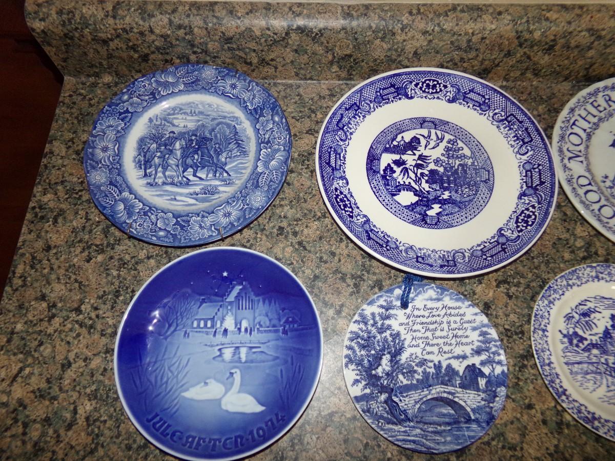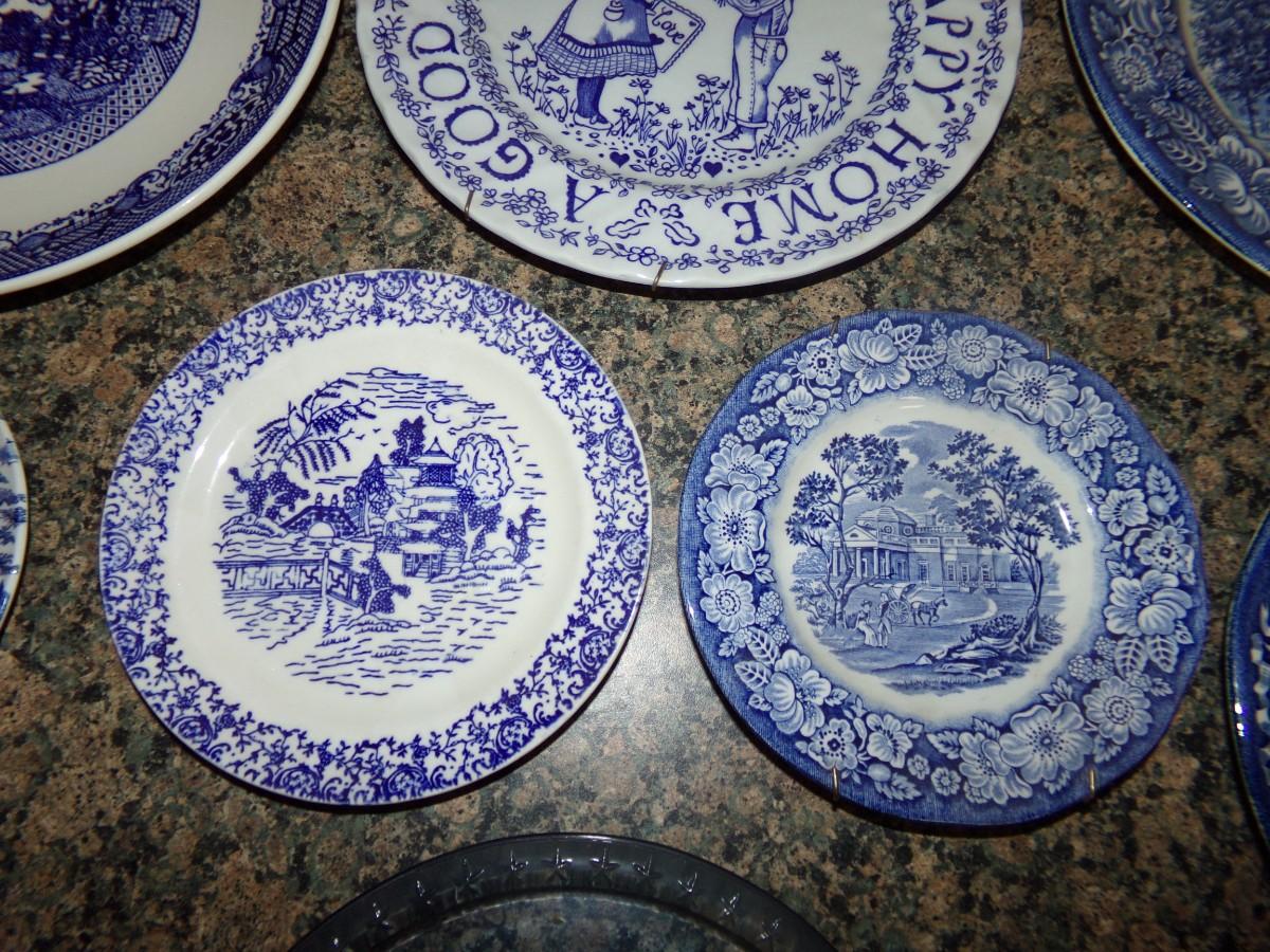 ASSORTMENT OF COLLECTOR'S PLATES, MOST ARE BLUE & WHITE PATTERNED. BEAUTIFUL COLORED BOWL WITH WICKER HANDLE.
