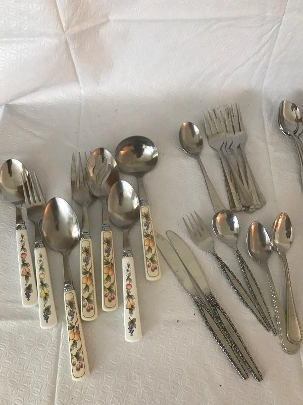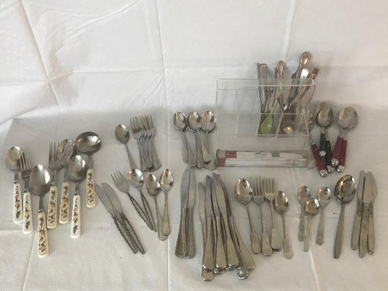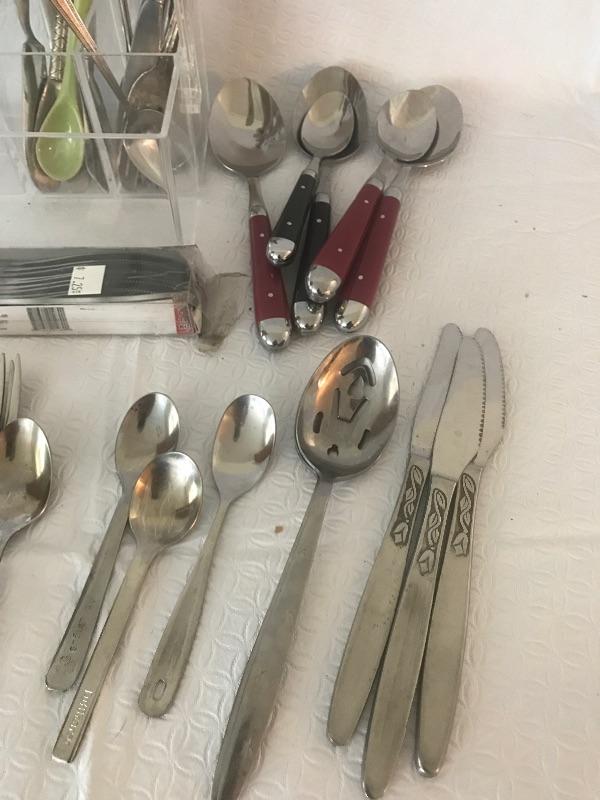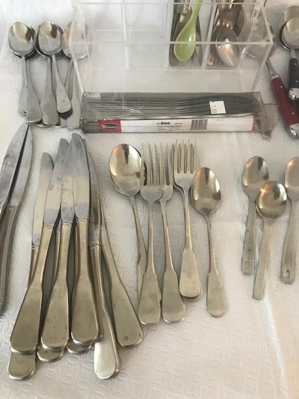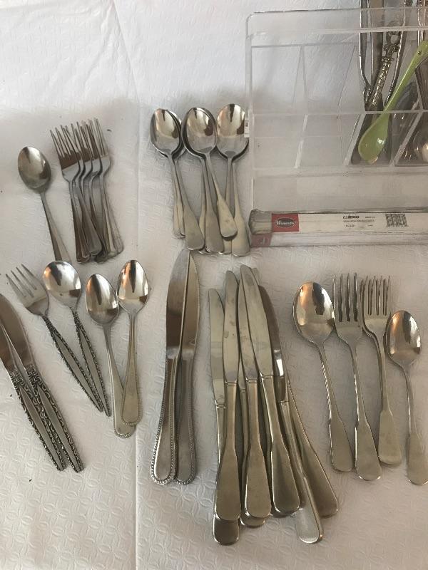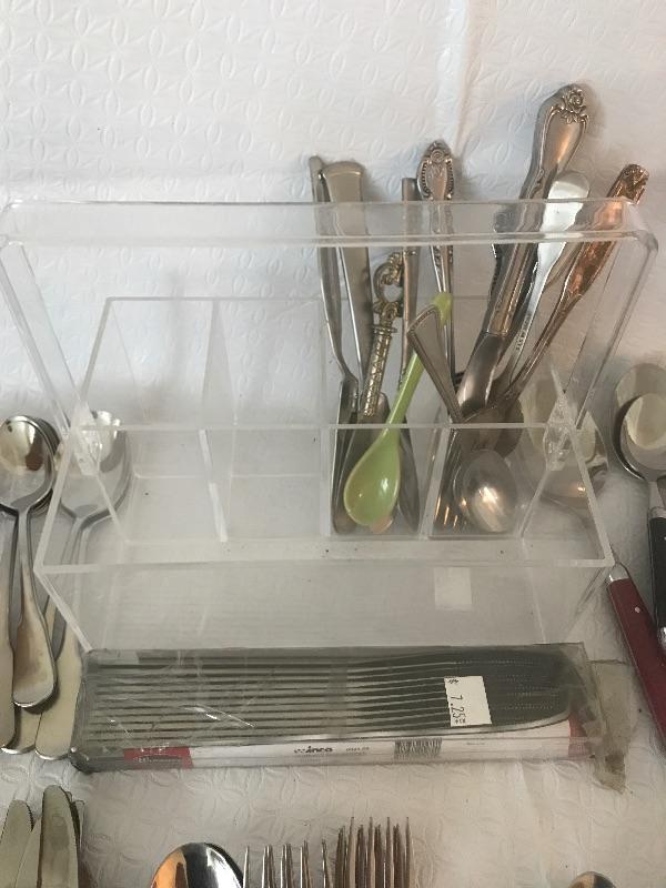 This light contains 77 pieces of stainless steel flatware and an acrylic organize with handle and napkin holder. Some of the names on flatware are Mikasa, Oneida, Amefa, Lacebon stainless by Present Korea and 1 dozen dinner knives new in box by Winco