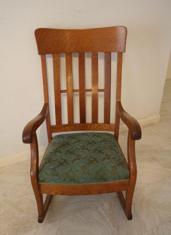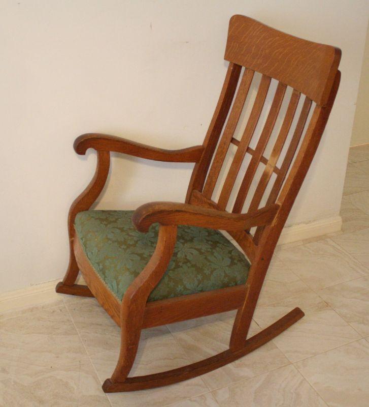 Vintage Rocking Chair with Green Fabric Seat - This vintage rocking chair is sturdy and well made with solid wood and the seat is cushioned with a patterned green fabric.