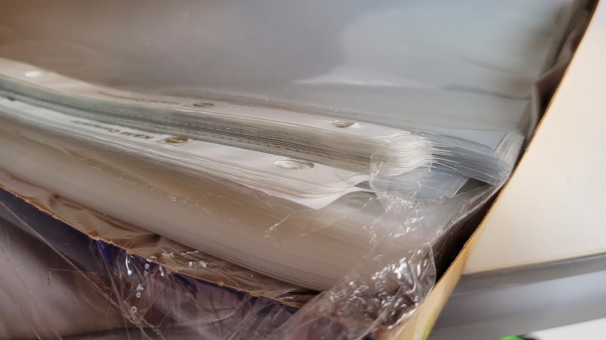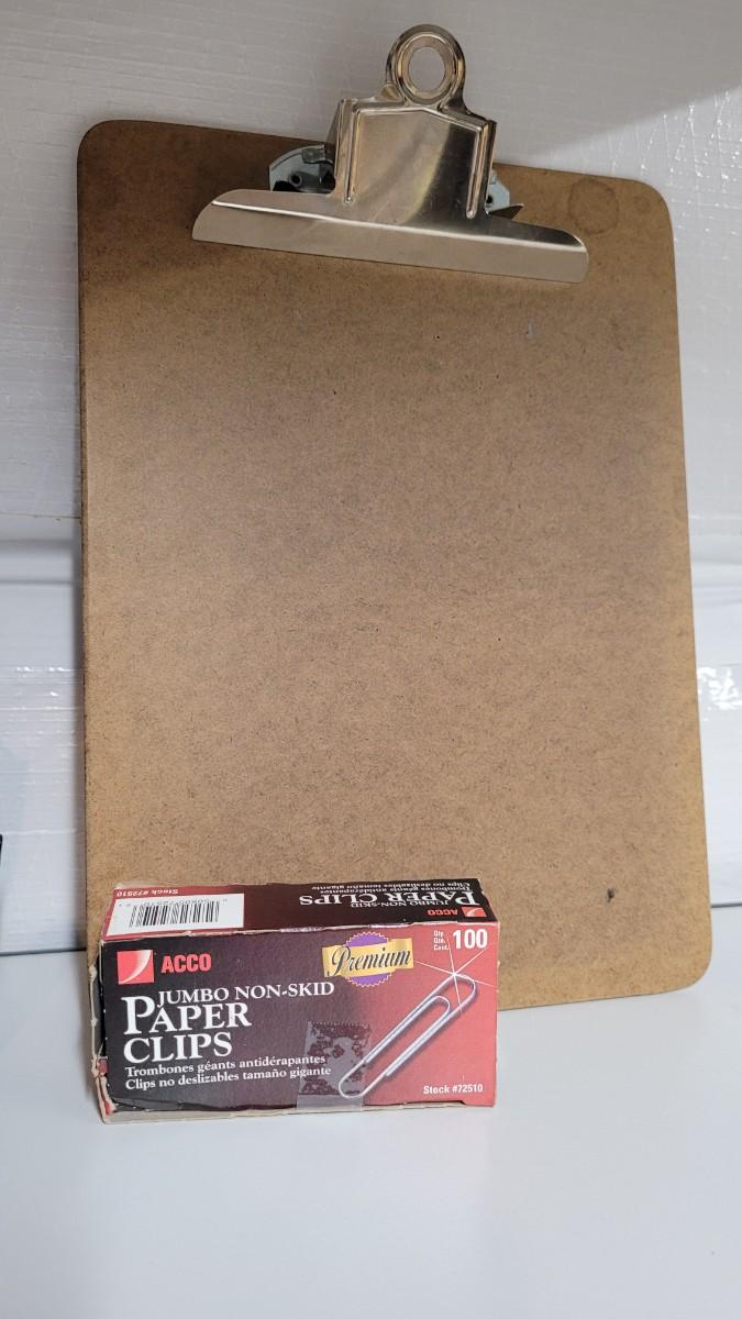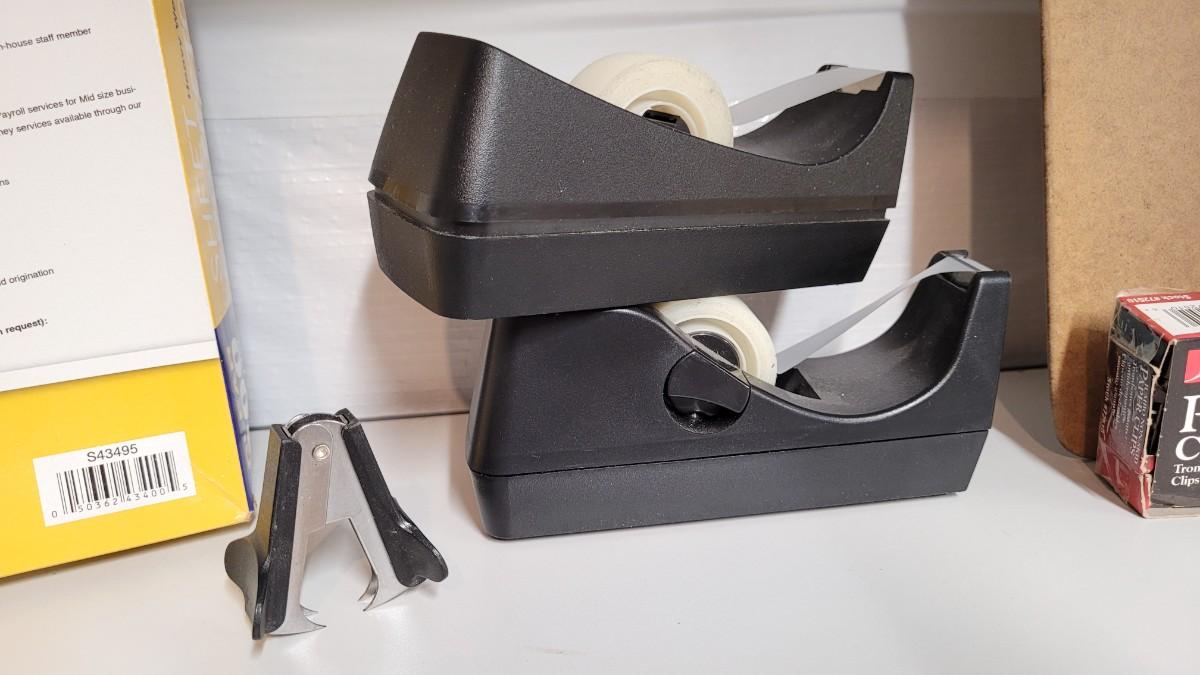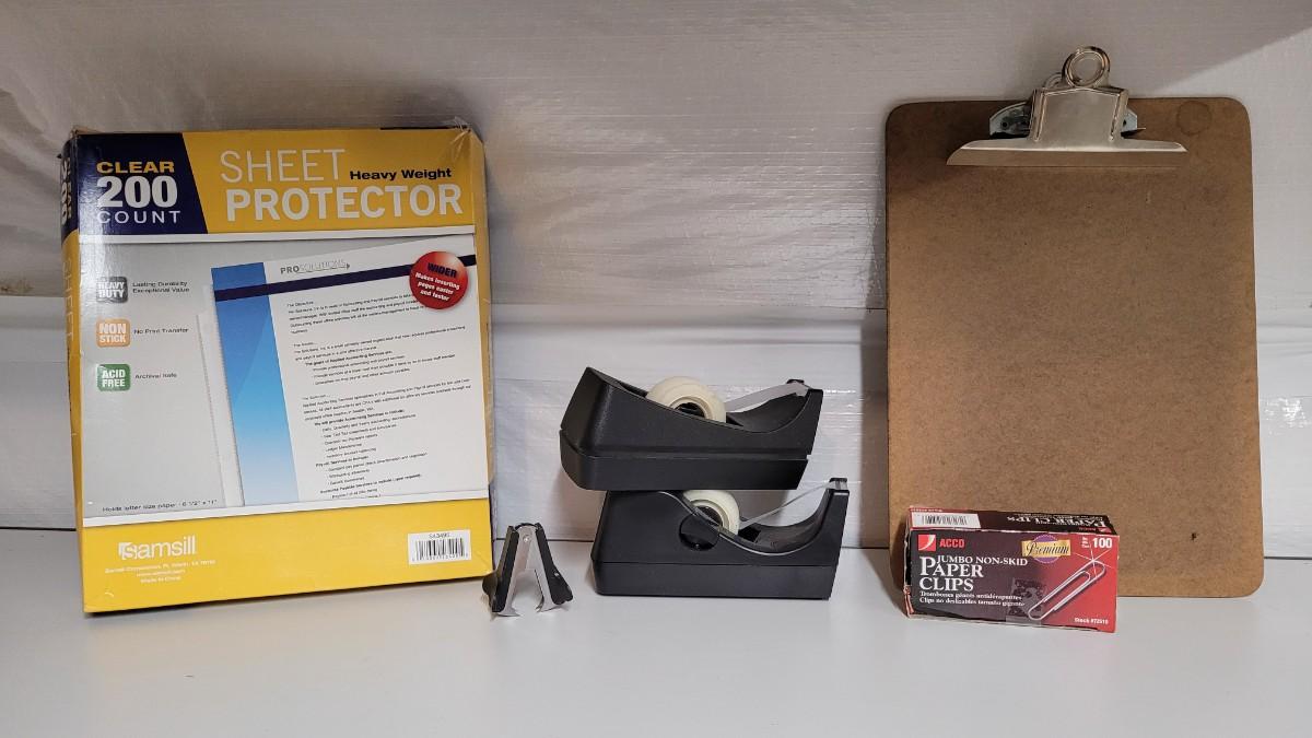 Lot 553: Office / School Supplies Bundle - Tape Dispensers, Protectors, Staple Puller and Clipboard