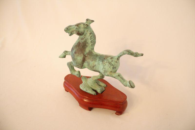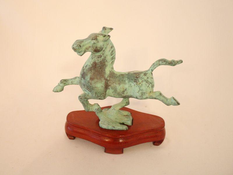 The horse is treading on a swallow and is meant to represent confidence and promotes the energy of success and freedom. This replica is cast from bronze with a wooden base. In good condition.