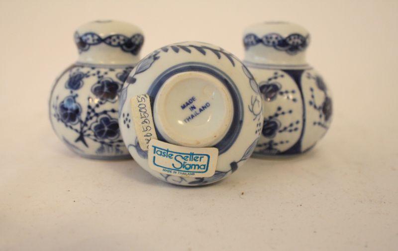 Blue & White Porcelain Salt Shakers and Small Vase Set - Two matching salt shakers and a vase. The small vase is made in Thailand by Taste Seller Sigma.
