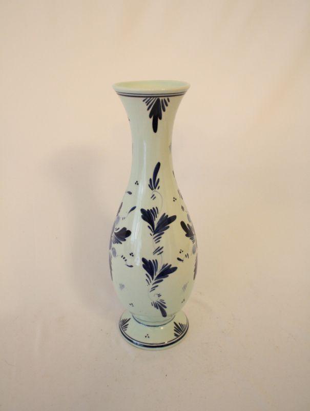 Vintage Delft Blue Dutch Art Pottery Windmill Vase - Hand painted bud vase made and marked by Delft Blue Dutch Artisan. Vase features a windmill design and abstract floral accents. Vase is about 10 inches tall.