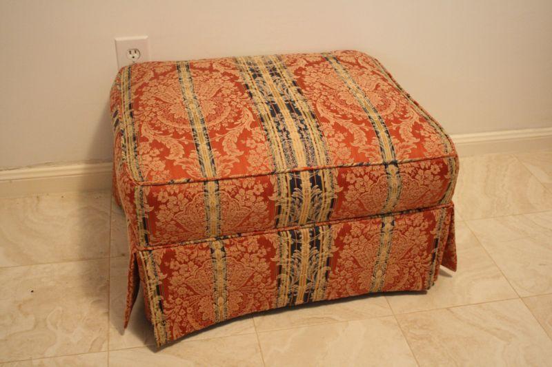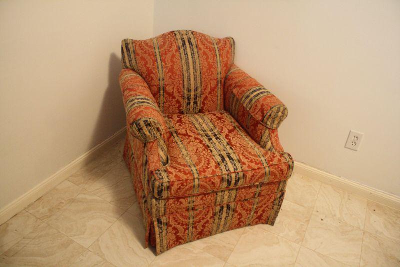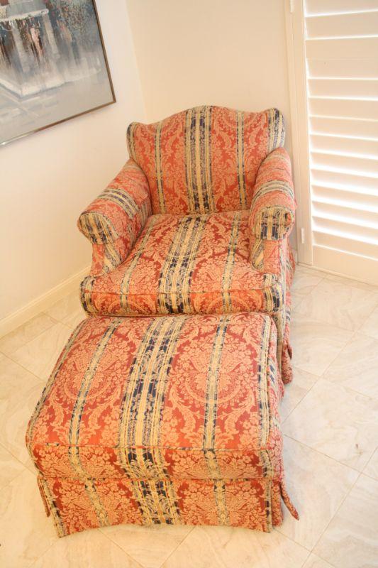 Vintage Baroque Pattern Armchair Accent Chair with Ottoman - Comfy armchair or accent chair with baroque style pattern in hues or red, gold, and blue. Comfy removable cushion and removable arm covers. In immaculate condition! Measures 30” (width) 31” (depth) 32” (height). Seat height is 18.5”. Ottoman measures 26” (width) 21” (depth) 16” (height).