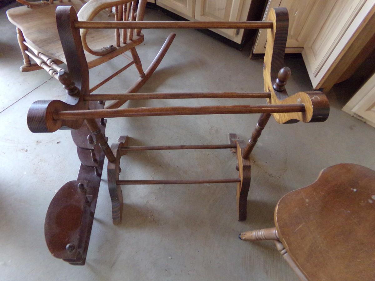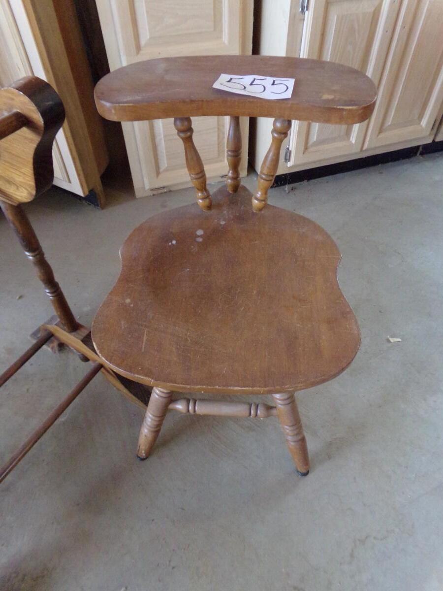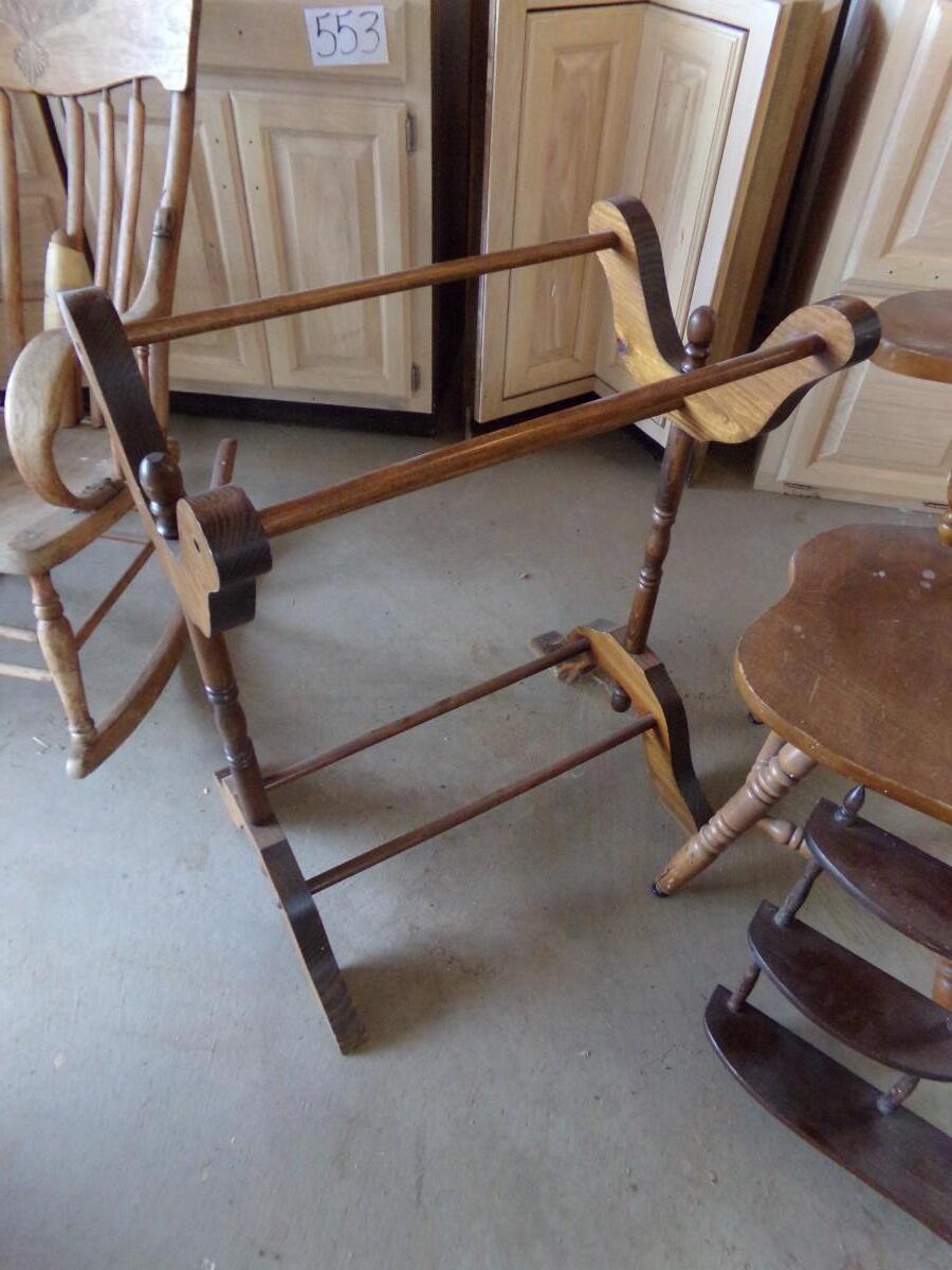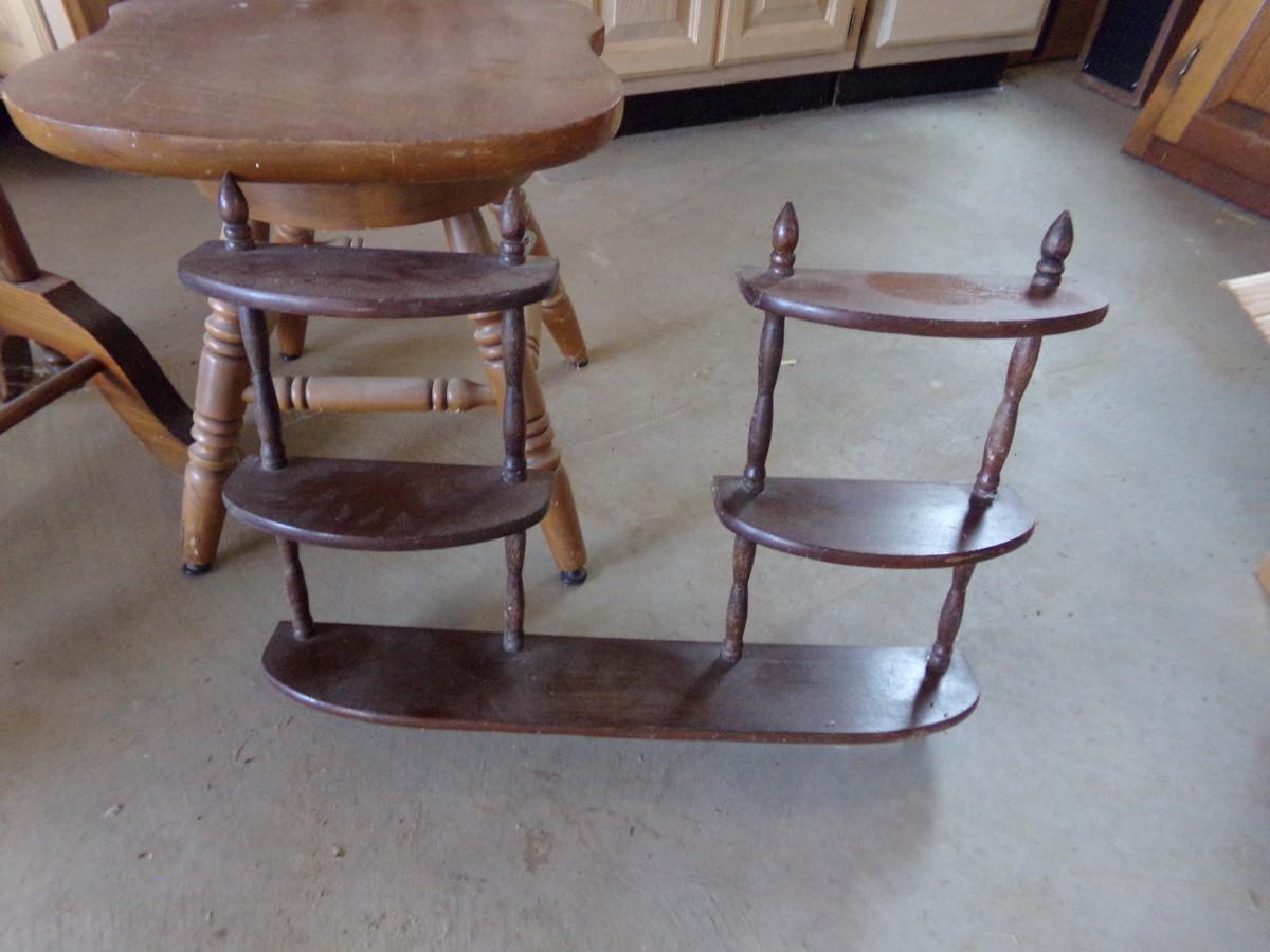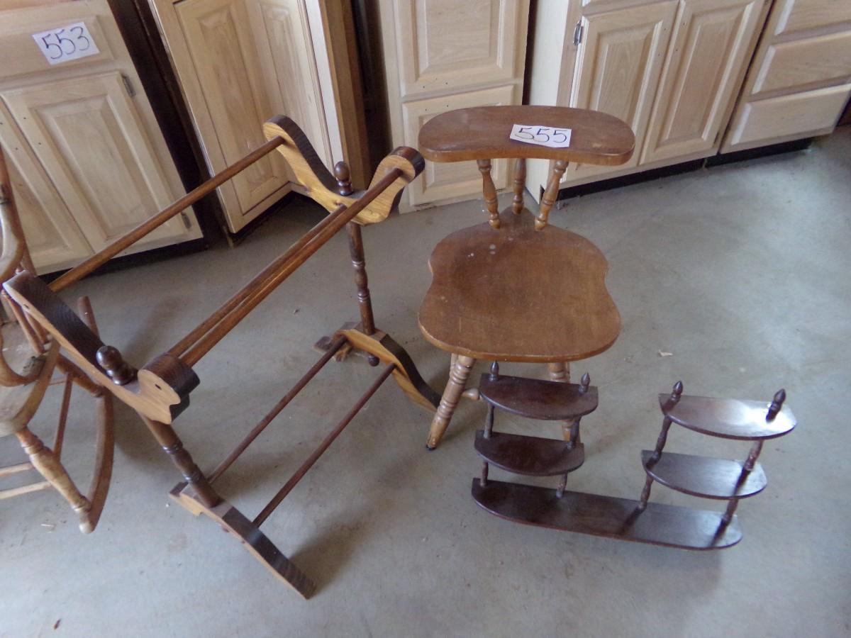 WOODEN QUILT RACK, WOODEN CHAIR AND WOODEN WALL SHELF.