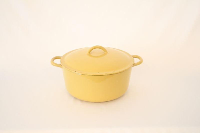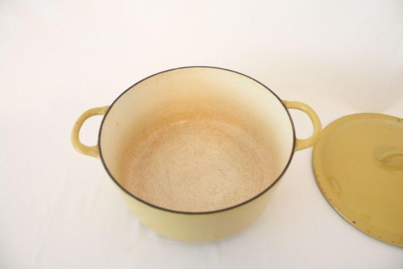 Vintage Yellow Descoware Enamelware Dutch Oven Pot - Mustard yellow dutch oven pot with lid mad by Descoware Belgium. In good used condition with signs of wear on the inside and on the bottom. 9 inches across.