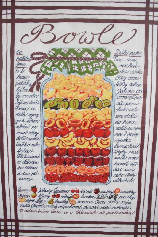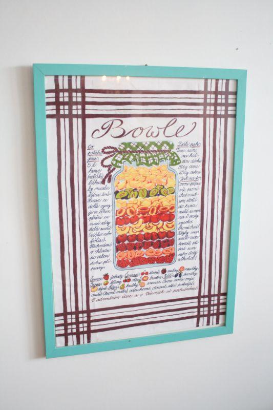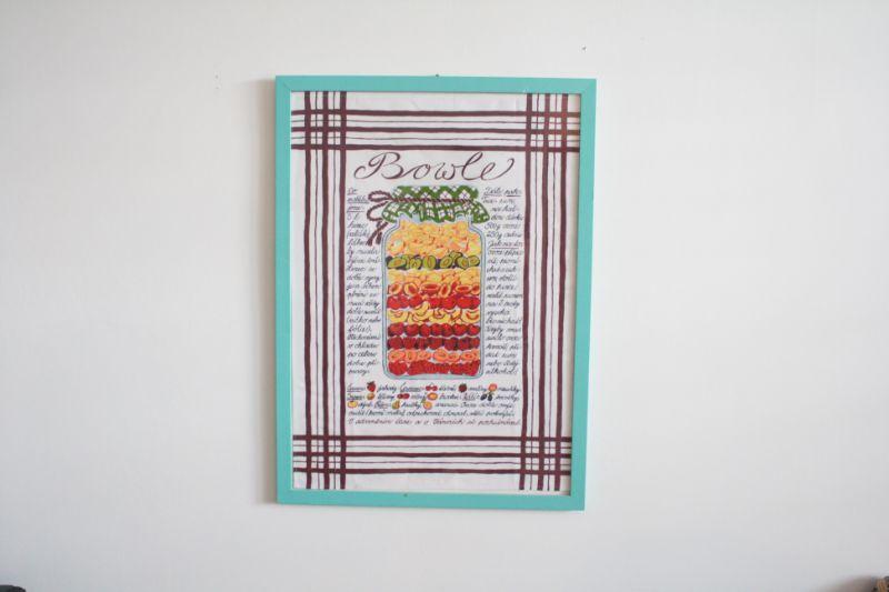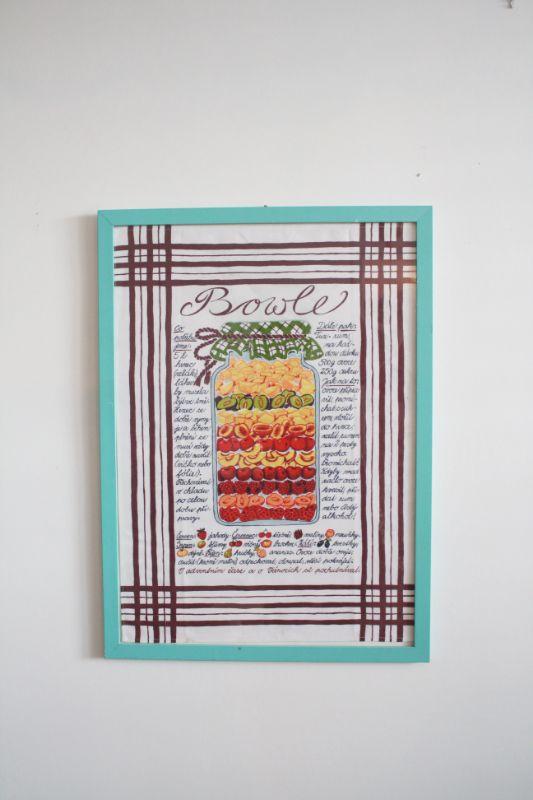Bowle fruit and rum recipe on tea towel behind glass frame.