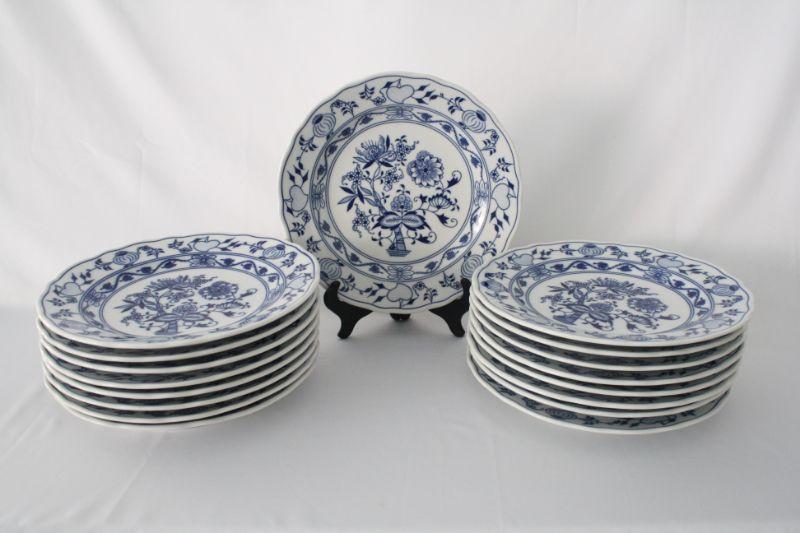 Vintage Zwiebelmuster Bohemia Blue Onion 9.5" Dinner Plates - Set of seventeen dinner plates made by Bohemia in Czech Repuplic. Marked "Zwiebelmuster". Pattern is "Blue Onion". In good condition with no chips or cracks.