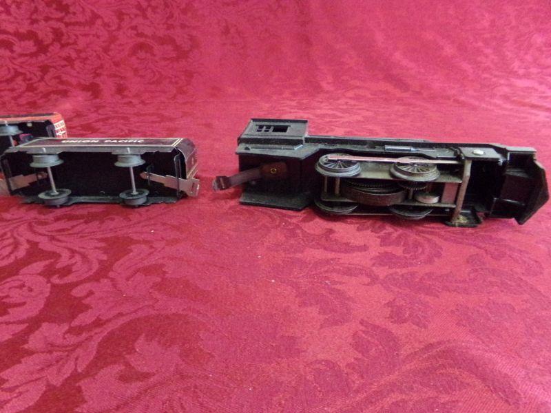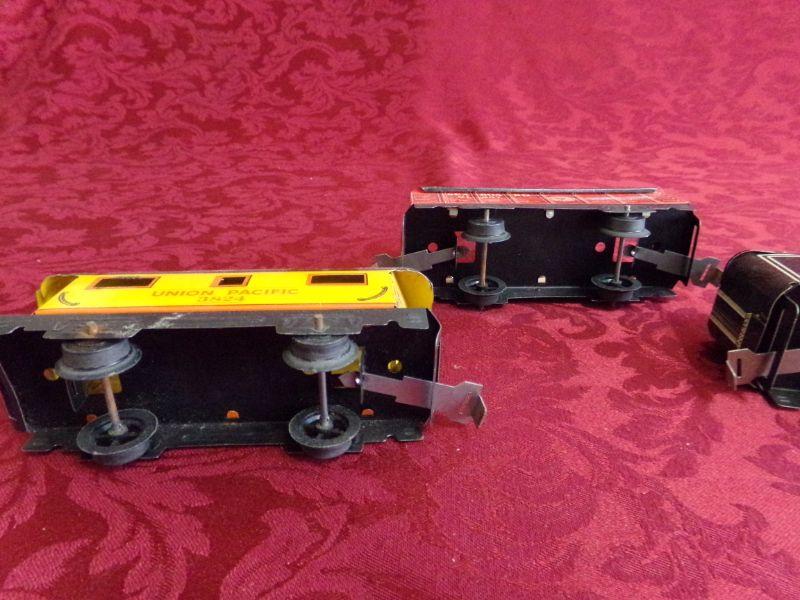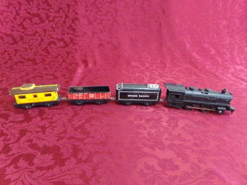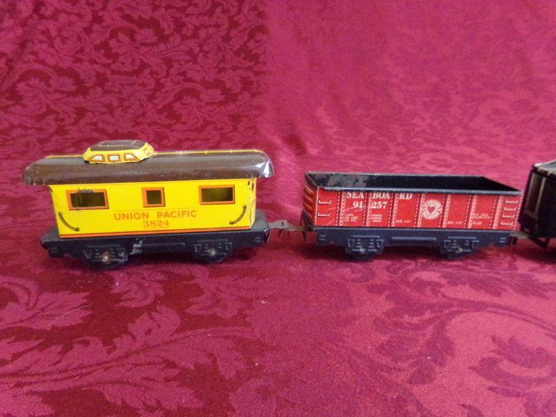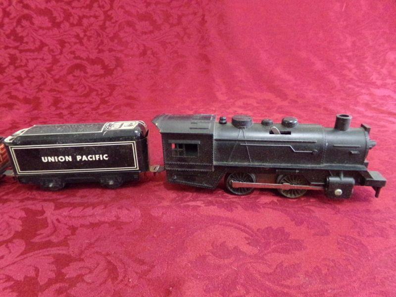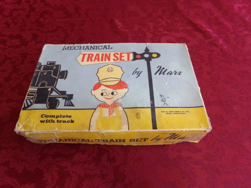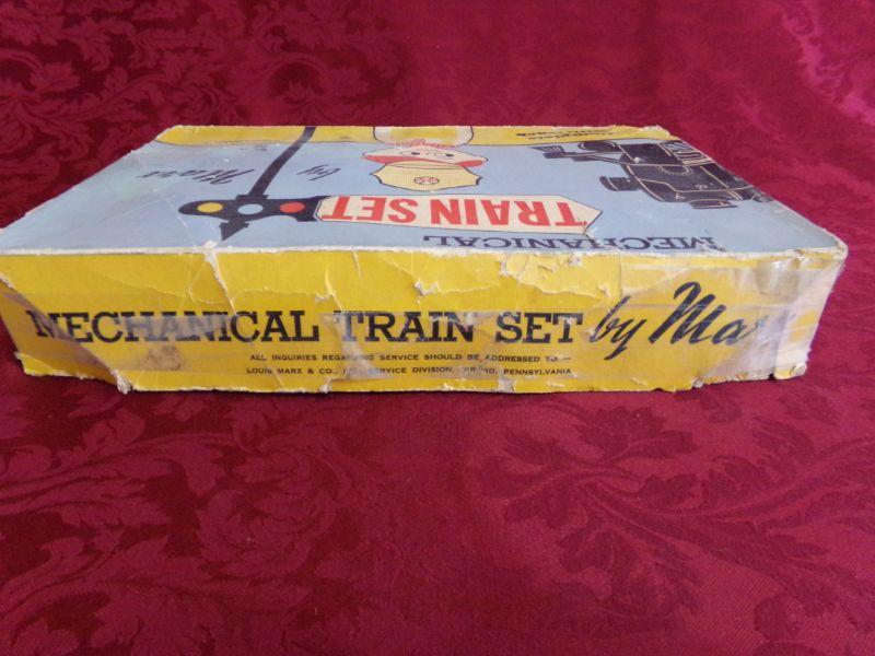 VINTAGE MARX MECHANICAL TRAIN SET. THE ENGINE DOES HAVE A PIECE BROKEN OFF ( PIECE IS INCLUDED ) IT IS IN FAIR CONDITION.