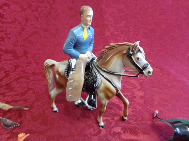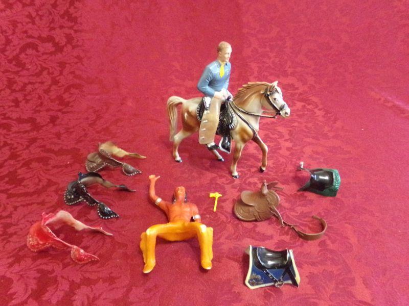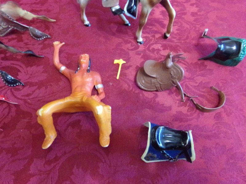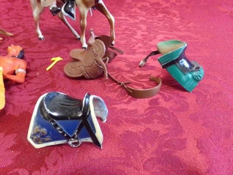 ROY ROGERS ON HIS HORSE, A NATIVE AMERICAN MAN, AND SADDLES. SOME OF THE SADDLES ARE BROKEN. THEY ARE IN FAIR CONDITION.