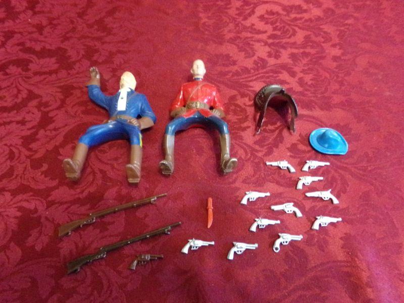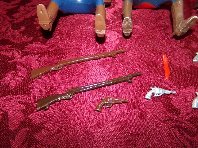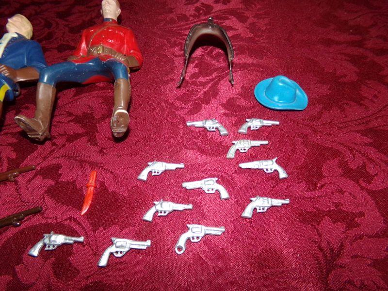 2 MEN, RIFLES AND PISTOLS, KNIFE, SADDLE, AND HAT.