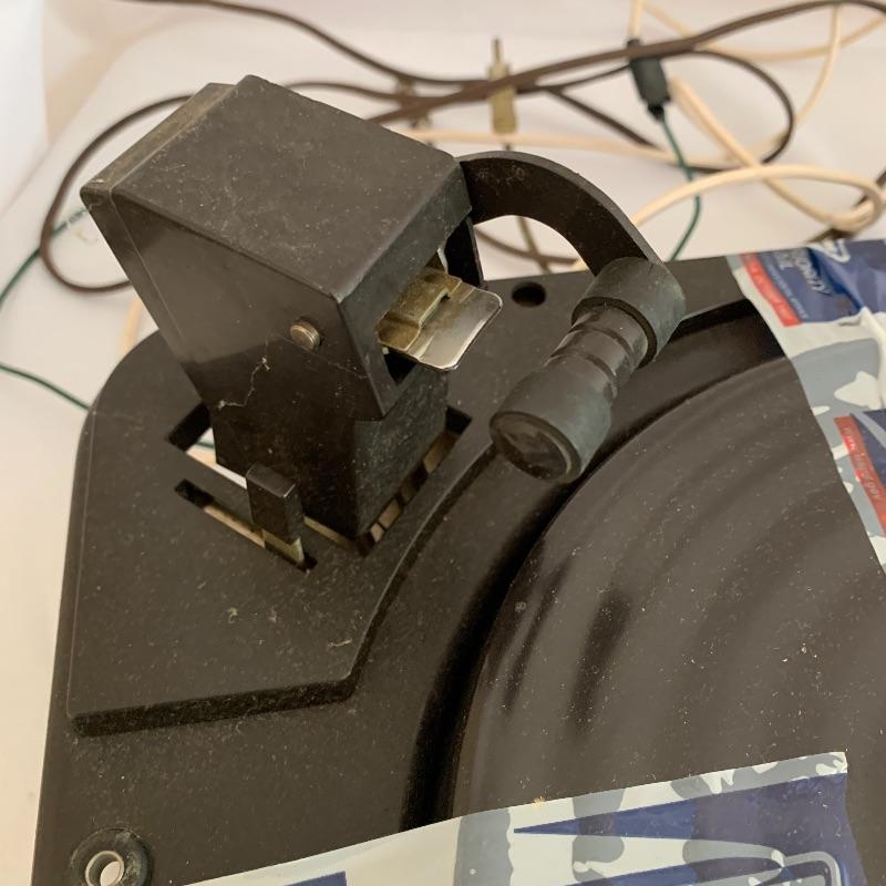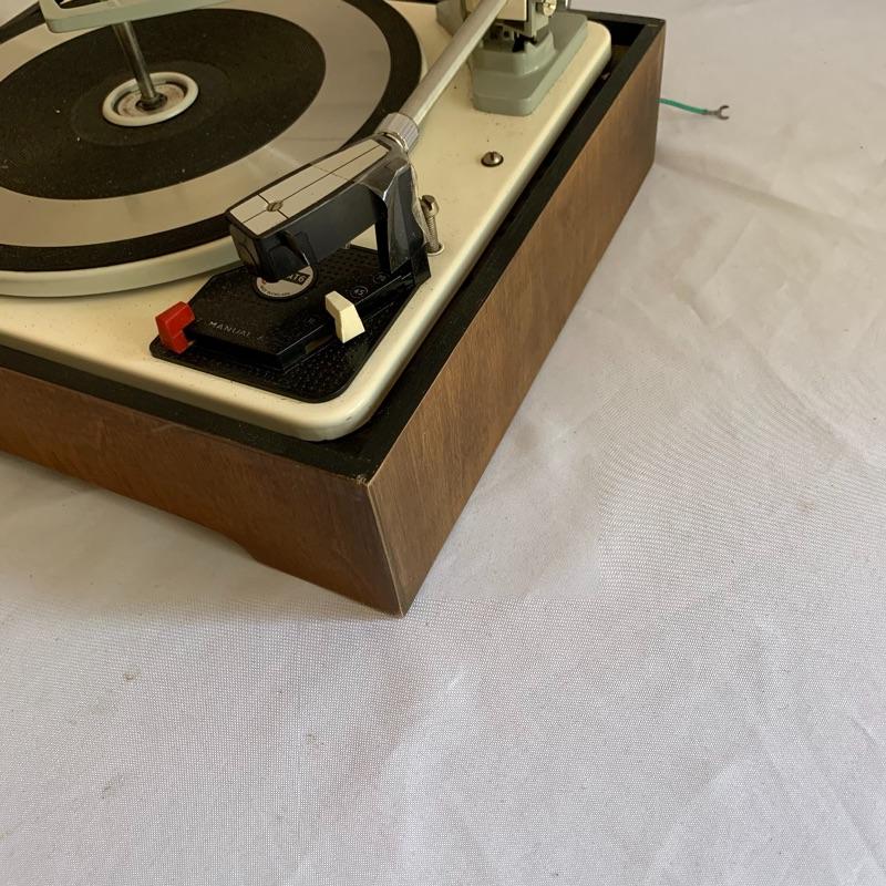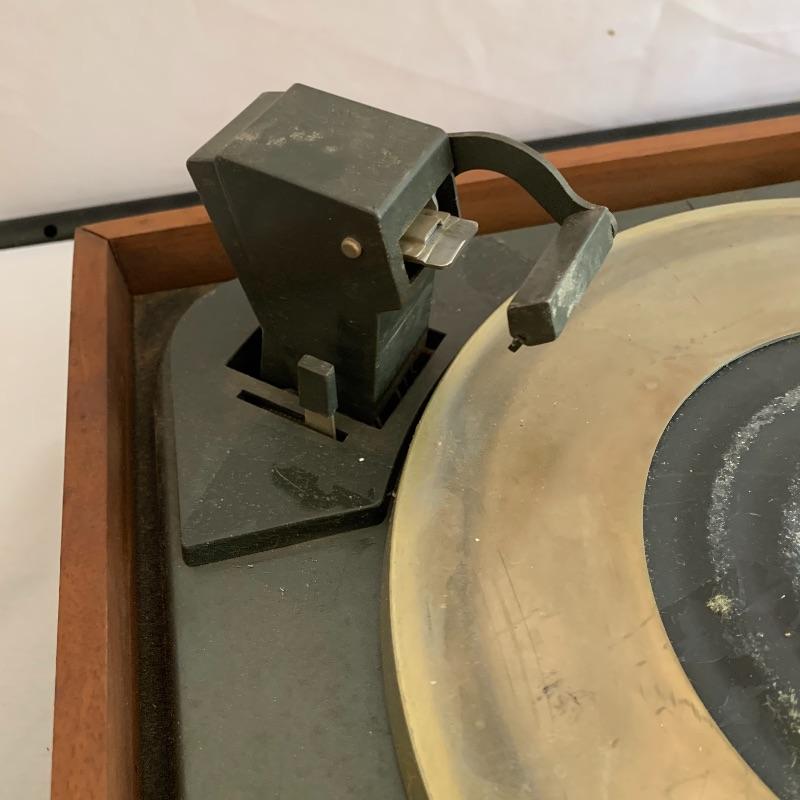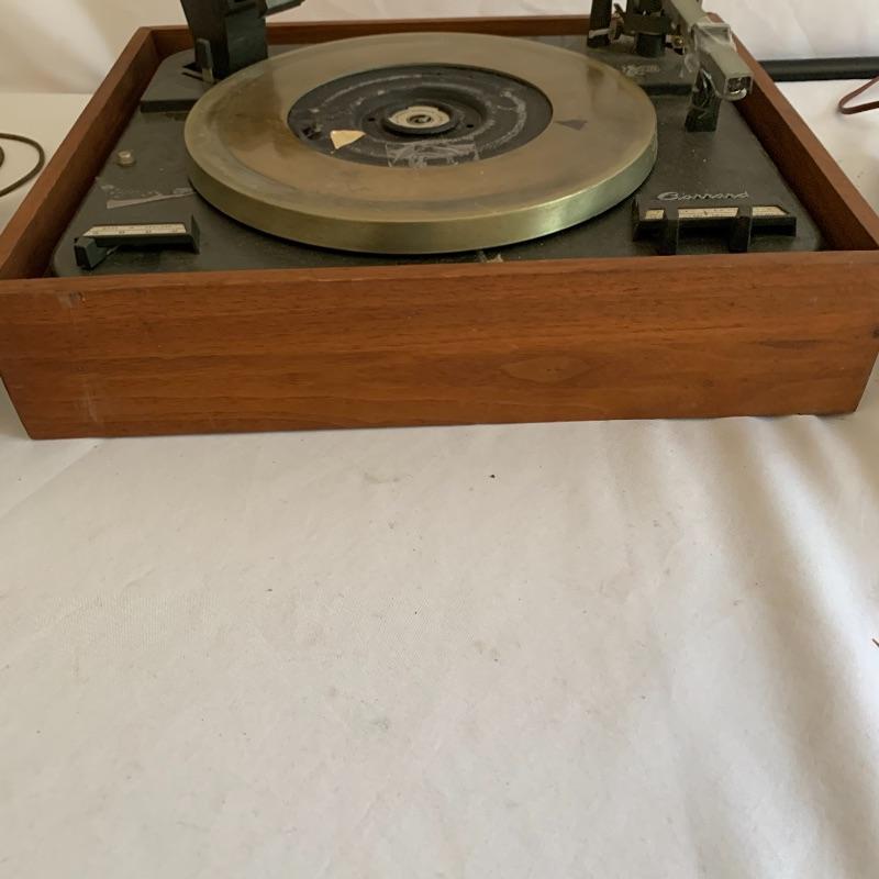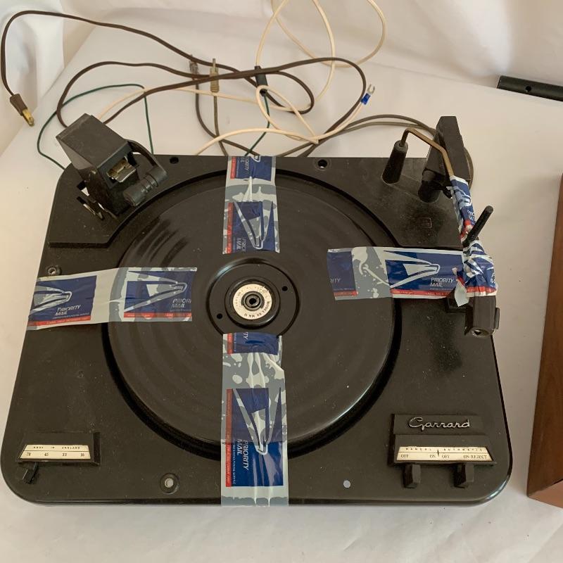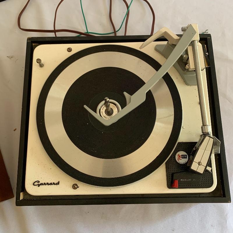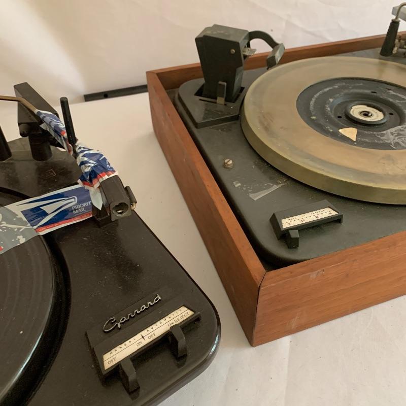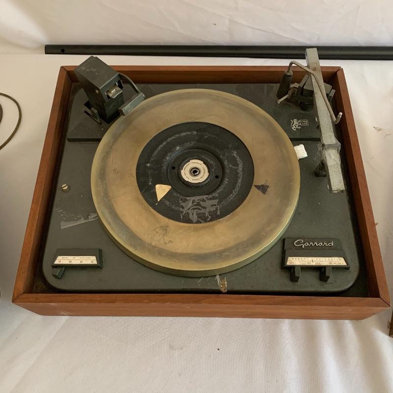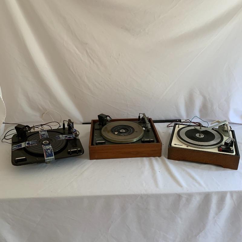 This lot features three Garrard turntables . The first (left in pic) is a Garrard model 88 and is missing its factory base but did power on when tested. The middle turntable is a Garrard model A70 and couldn’t be tested due to missing plug. The third is a Garrard AT6 and did not power on when tested.