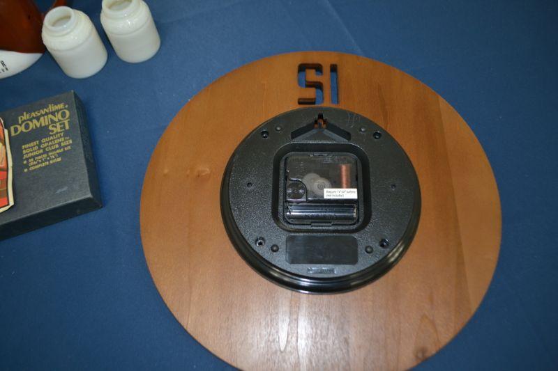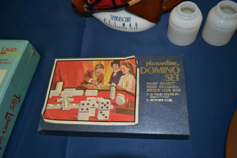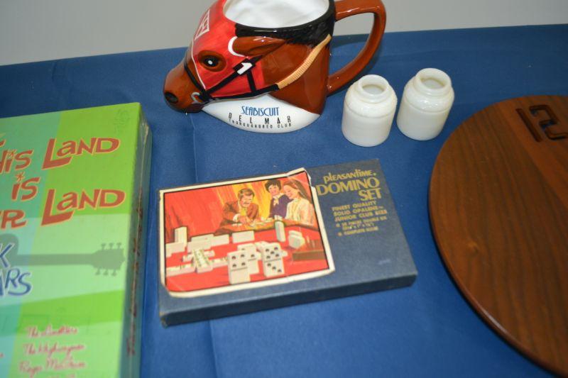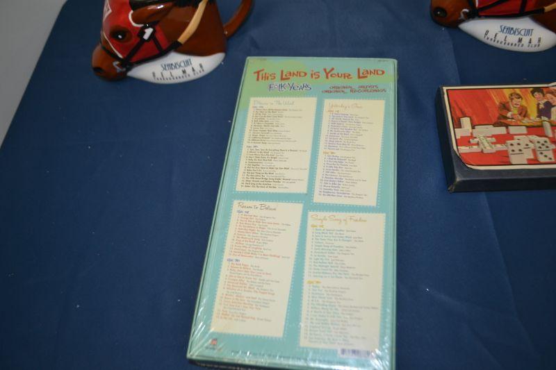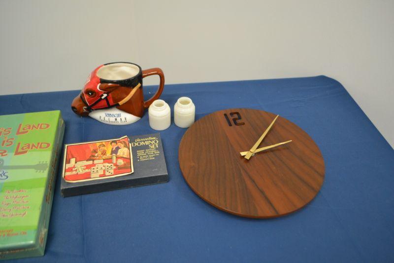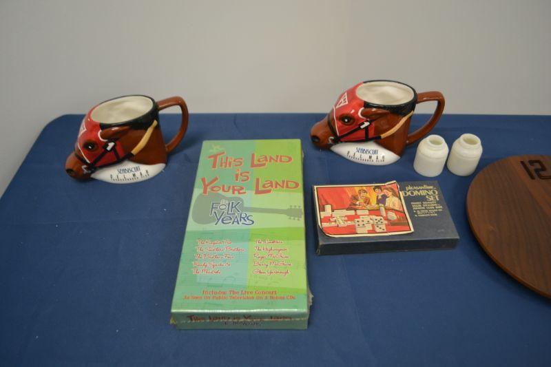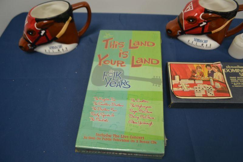 MISC ITEMS MUGS, CLOCK, CD SET AND VINTAGE DOMINO SET