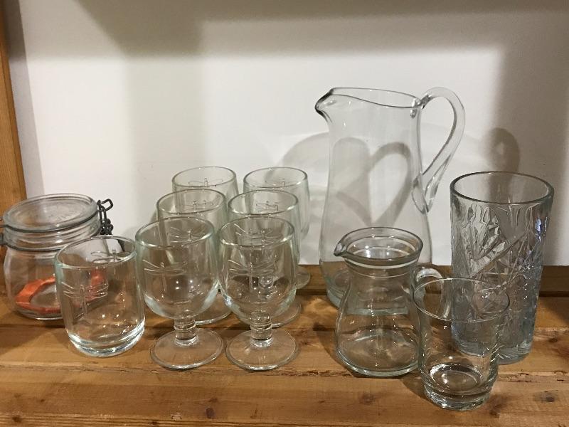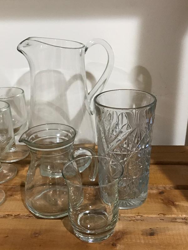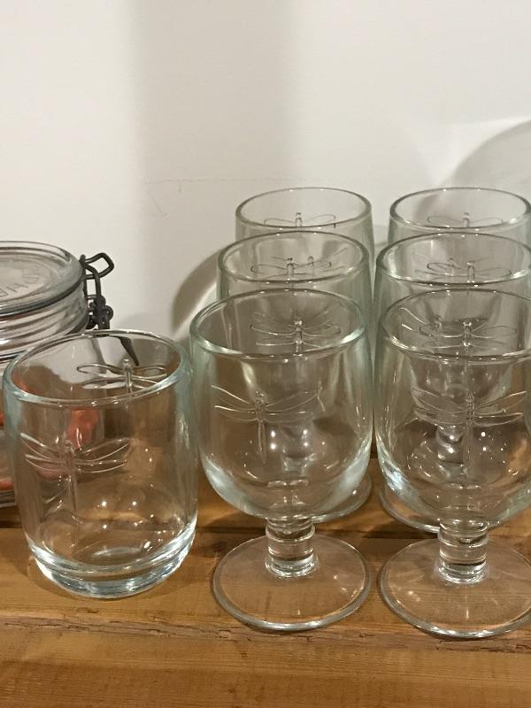 Set of 7 glasses with Dragonfly by La Rochere France, lg. Glass pitcher, small glass pitcher, Sm. Glass canister