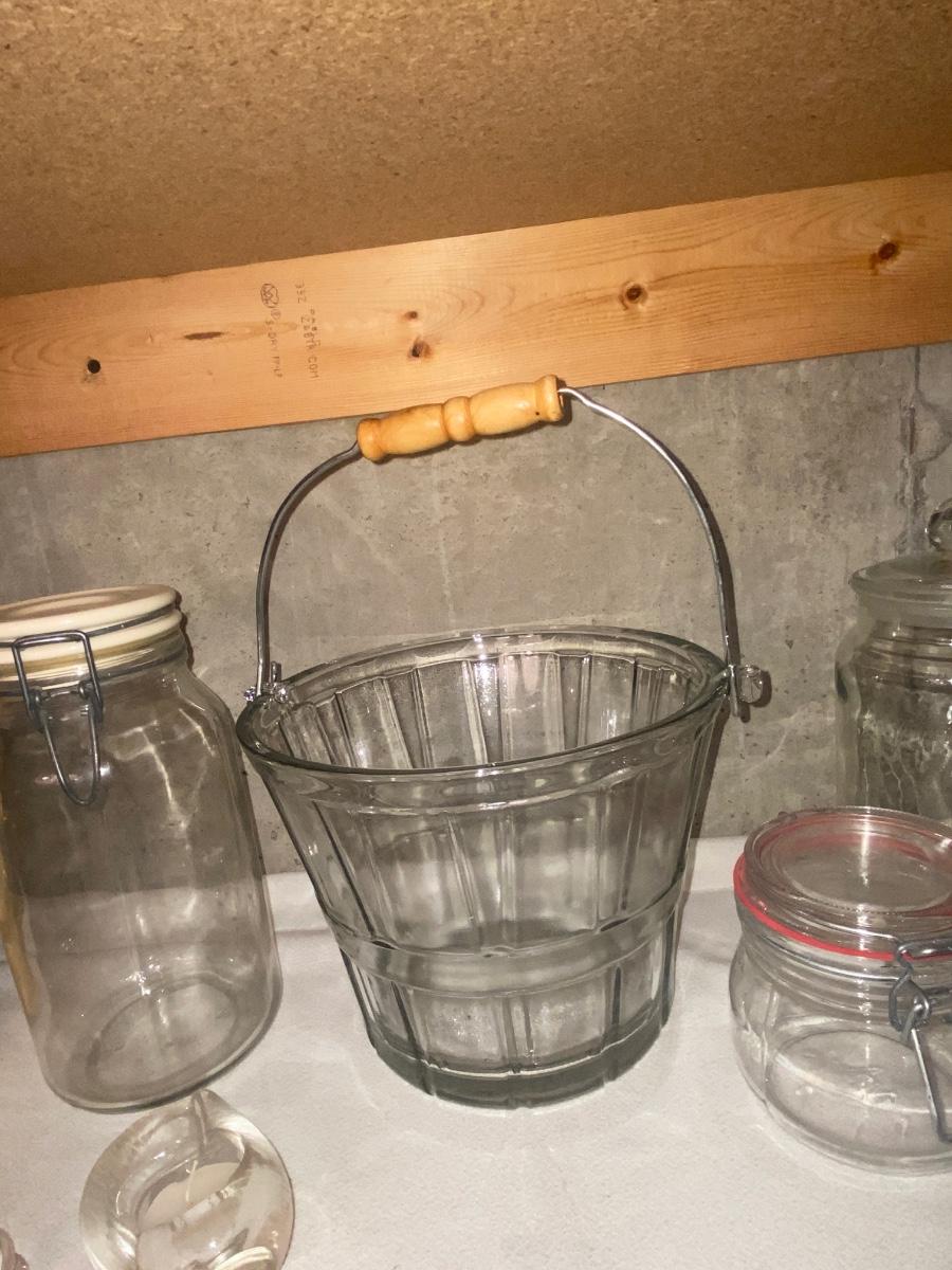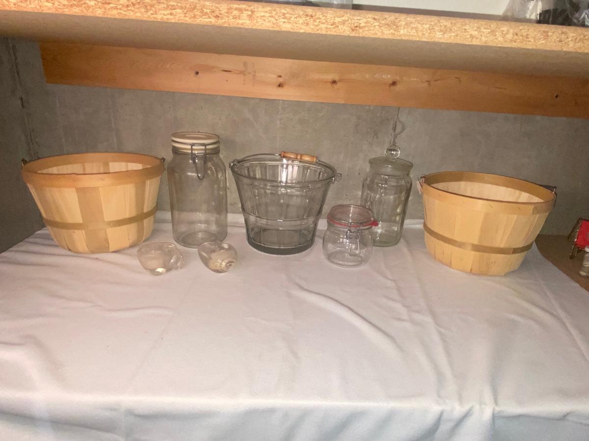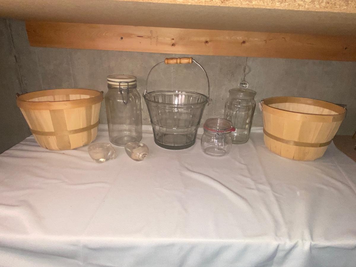 GLASS ICE BUCKET AND CANISTERS PLUS 2 BUSHEL BASKETS