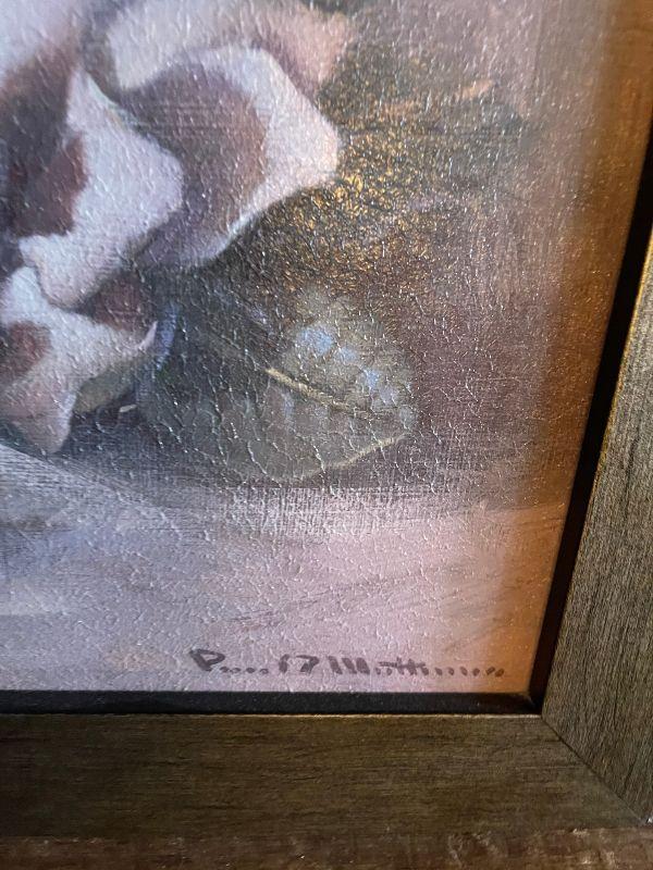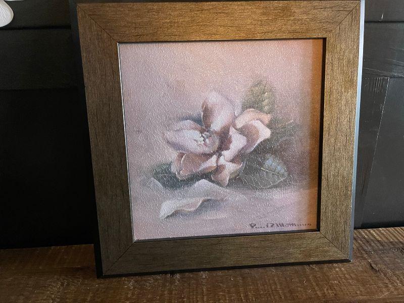 Framed picture of white flower and tall white flower in pot