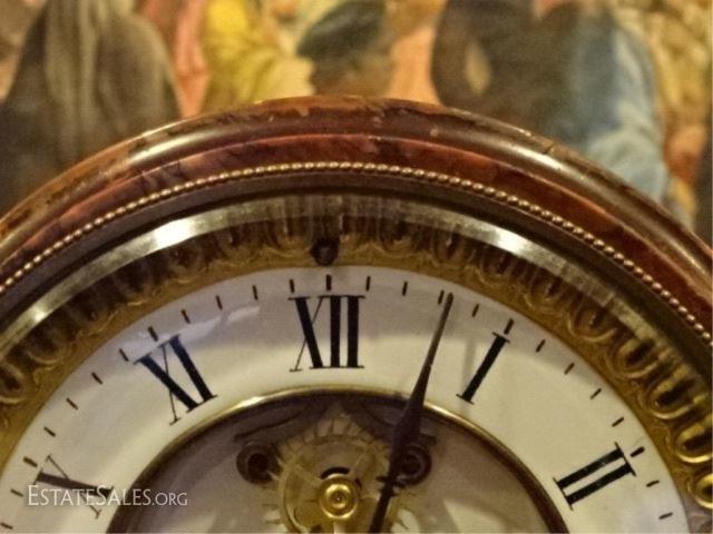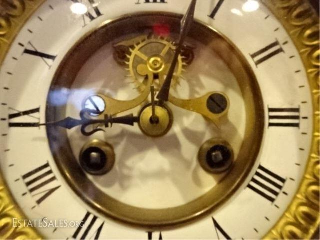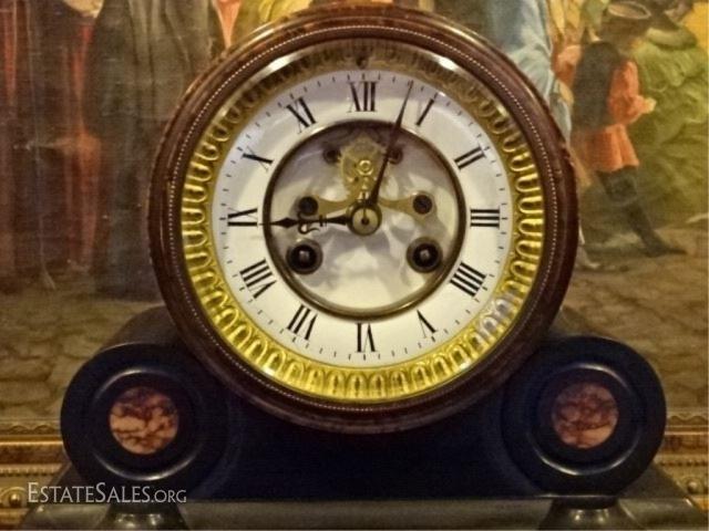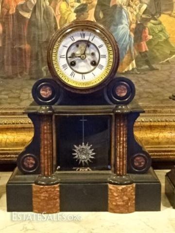 LOT 55A: 19TH CENTURY FRENCH BLACK MARBLE CLOCK GARNITURE, THE CLOCK WITH DRUM TOP, THE DIAL WITH VISIBLE ESCAPEMENT, WITH VISIBLE PENDULUM, VERY GOOD CONDITION, WITH KEY, CLOCK MEASURES 15"H X 12"W X 5"D, GARNITURE 9"H X 6"W X 4.5"D, SKU192.12