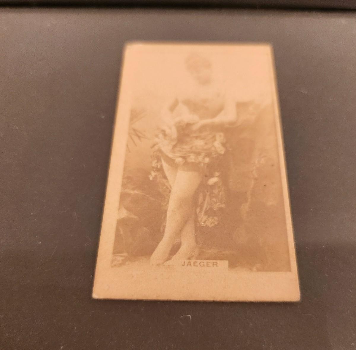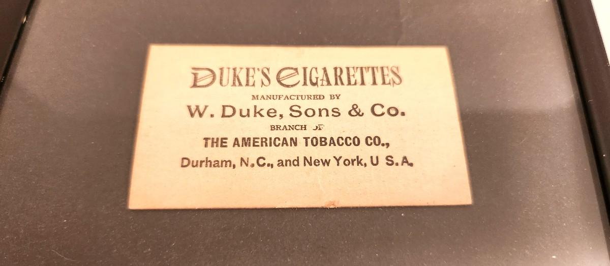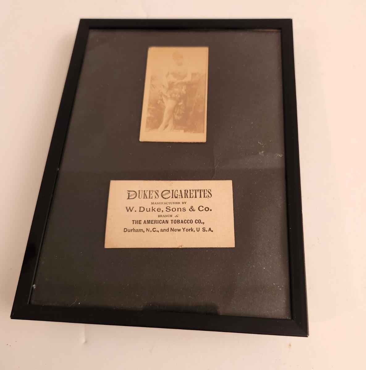 Cool lot of 2 antique Duke's Cigarette cards - 1890's - sepia toned - modern frame. Top one is of a scantily (by 1890 standards) clothed female - the other strictly advertising. Larger is 2.75" x 1.5", the other is 2.5" by 1.5" inches. Scarce in any condition.