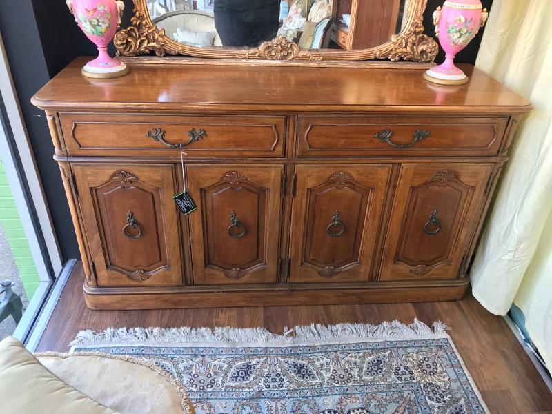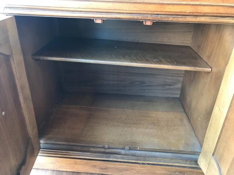 Very nice buffet/console by Thomasville in the French country style. Pecan finish. Drawers over cabinets. Great for dining room, foyer, or for your flat screen TV. 20" x 35 1/2" x 62" L