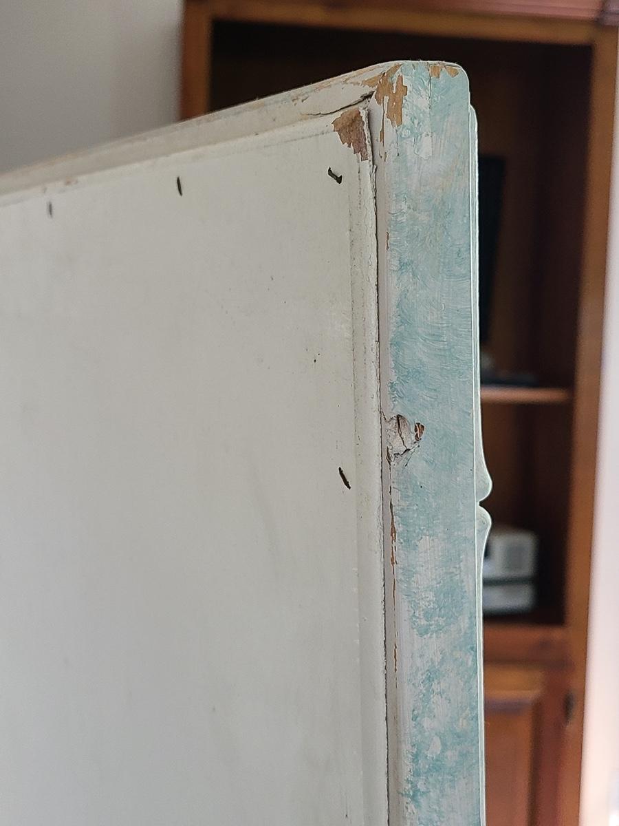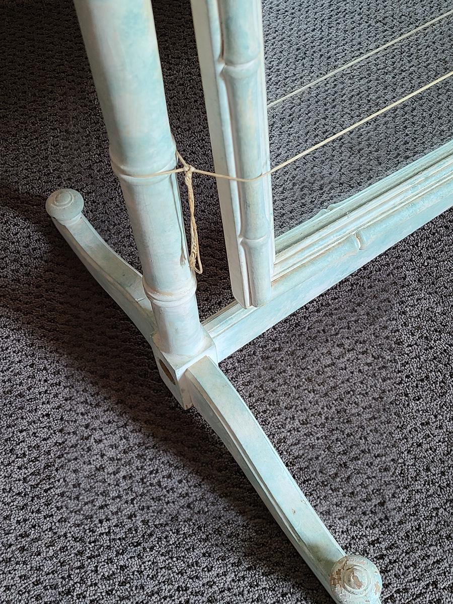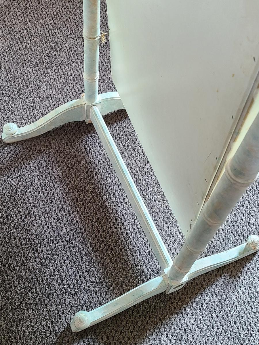 This is a vintage piece that at one time looked like Bamboo and was repainted. It could use a new look with fresh paint. It is solid and heavy. It does need some tweaking and tightening to the frame. Located upstairs and you will need to be able to carry downstairs. Fun project piece! Please see all pictures as they are the best representation of the items in the lot, the condition of the lot, and will show measurements if taken. If purchasing furniture you must be able to move yourself with your own help, and truck. .