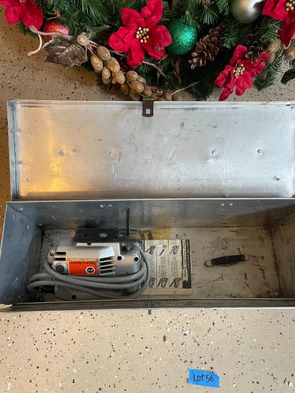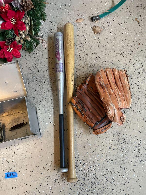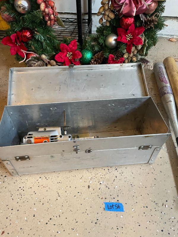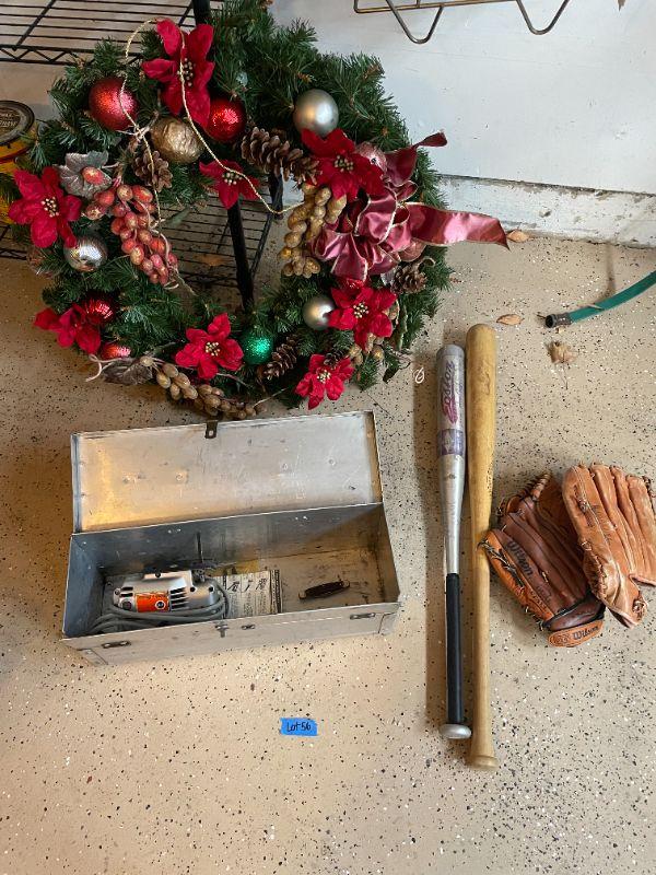 Lot 56 - (2) baseball bats, (2) baseball gloves, tool box, Black and Decker jigsaw, pocket knife, christmas wreath