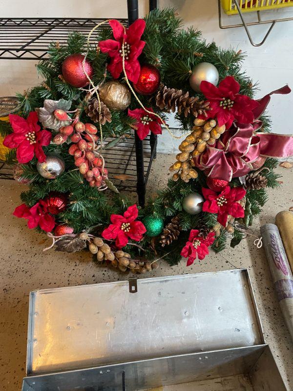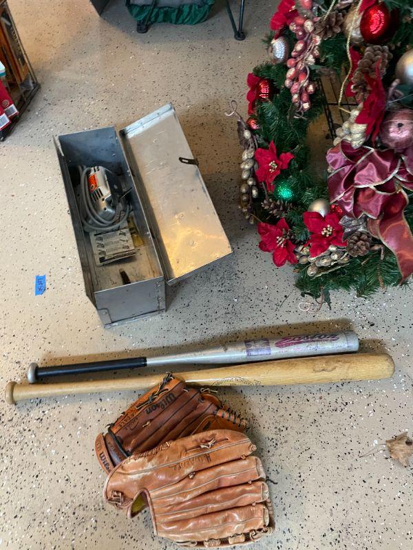 (2) baseball bats, (2) baseball gloves, tool box, Black and Decker jigsaw, pocket knife, christmas wreath.