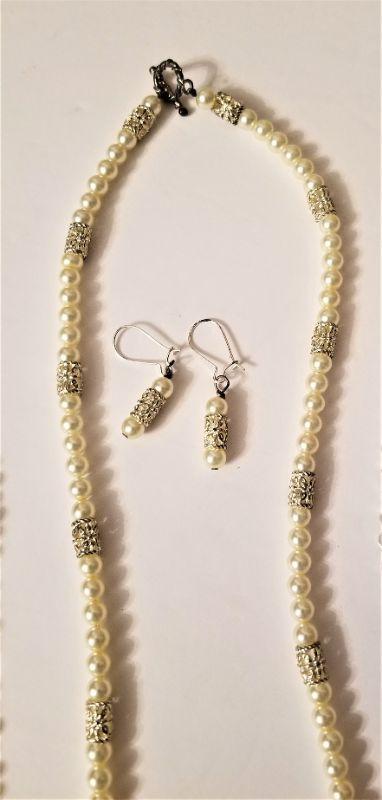 Nice contemporary lot here - small necklace with freshwater pearls, gold filled clasp (16") - 1 longer costume pearl necklace (22") with toggle clasp and silverplate accents - matching pierced earrings (1.5" long) - clear faceted crystal bead necklace (screw clasp), 33" long.