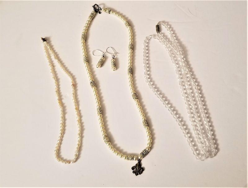 Lot #56  2 Natural Pearl necklaces, 1 crystal bead necklace, 1 pair pierced earrings.