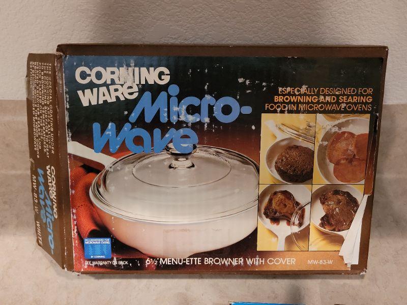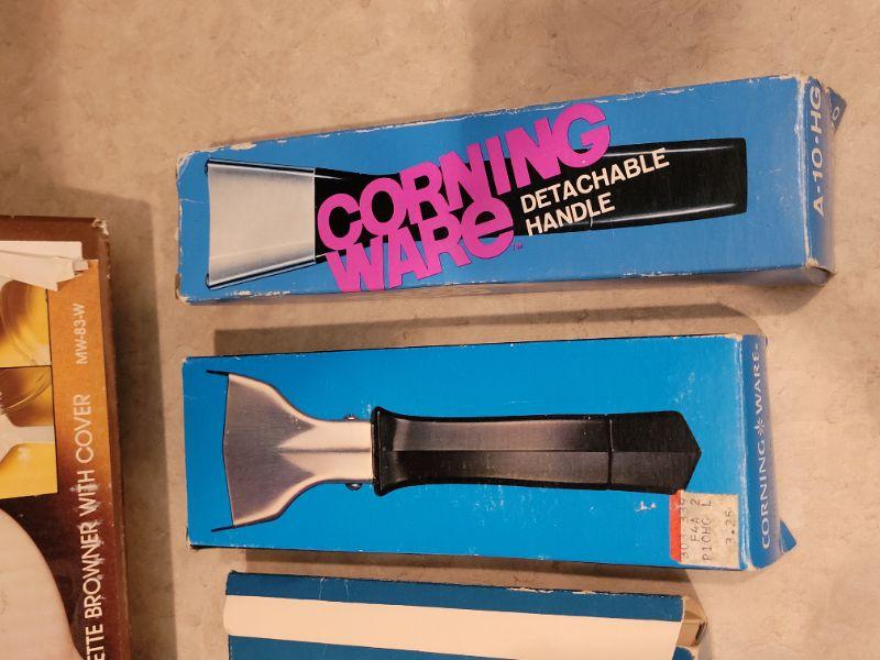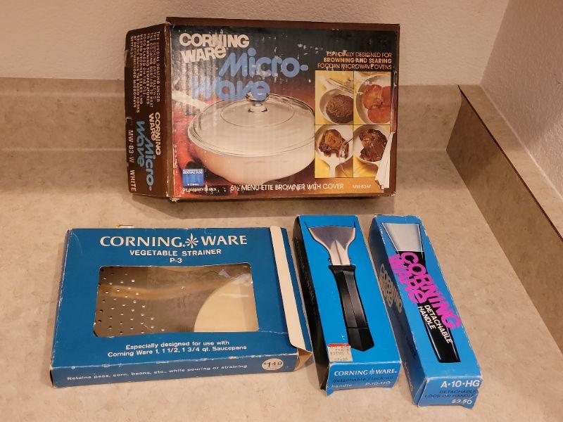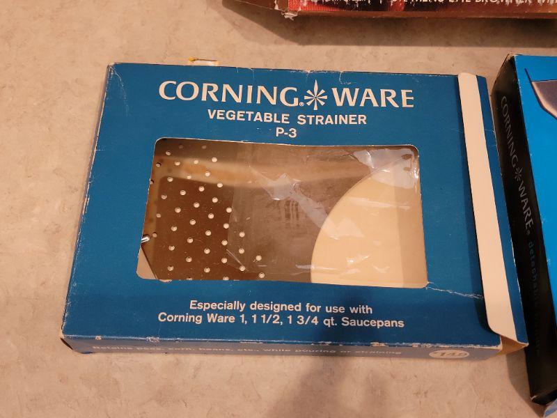 Lot 56: NEW OLD Stock Corning Ware (2) Handles, Microwave Dish and Veggie Strainer