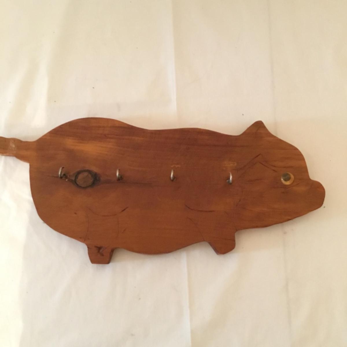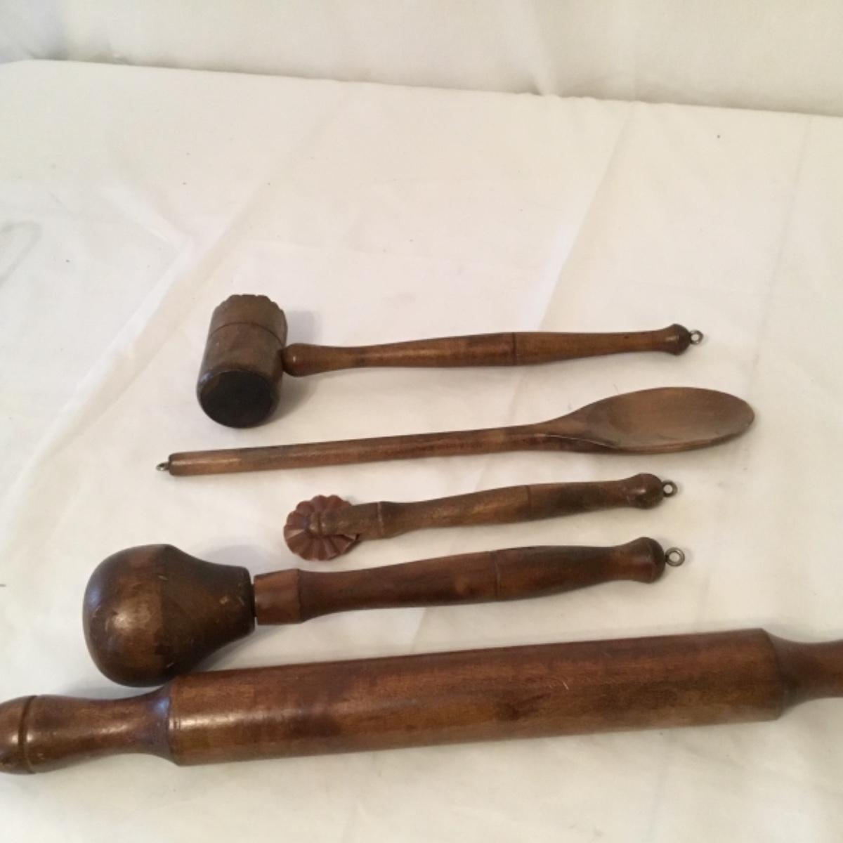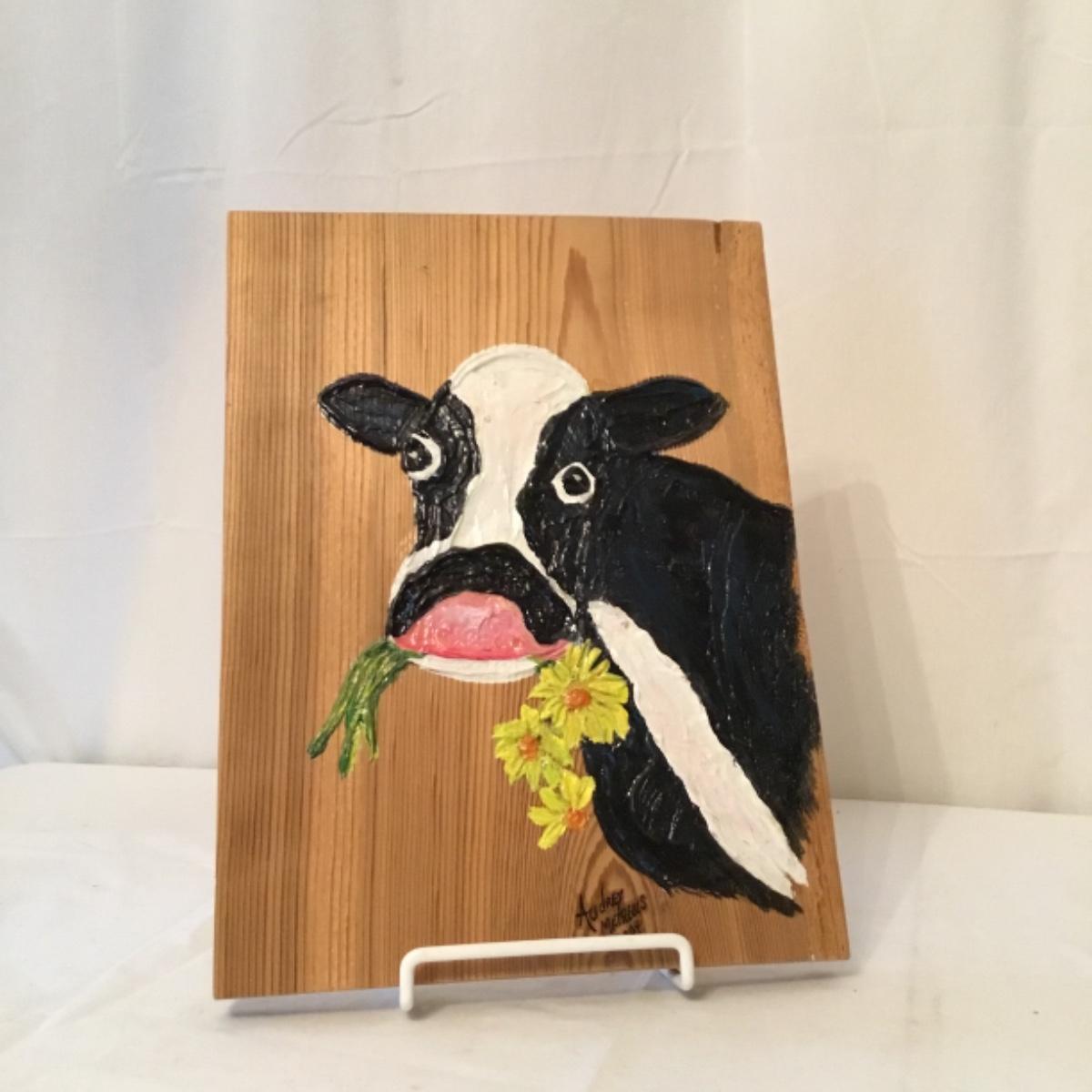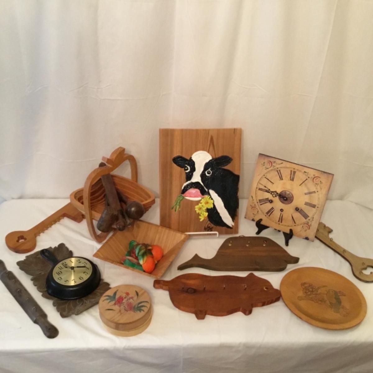 An adorable lot to keep your kitchen organized and decorated! Five wooden mountable hook organizers. There's a signed cow painting from a local Canton artist included. Painting measurements are 11”x15”. A wooden collapsable fruit basket that stands 13.5” tall and wooden utensils, see photos. A pair of wooden hamburger press, a wooden bowl, and a plate, along with a castiron and wooden clock can also be noted in this lot, see photos! Local pickup only.