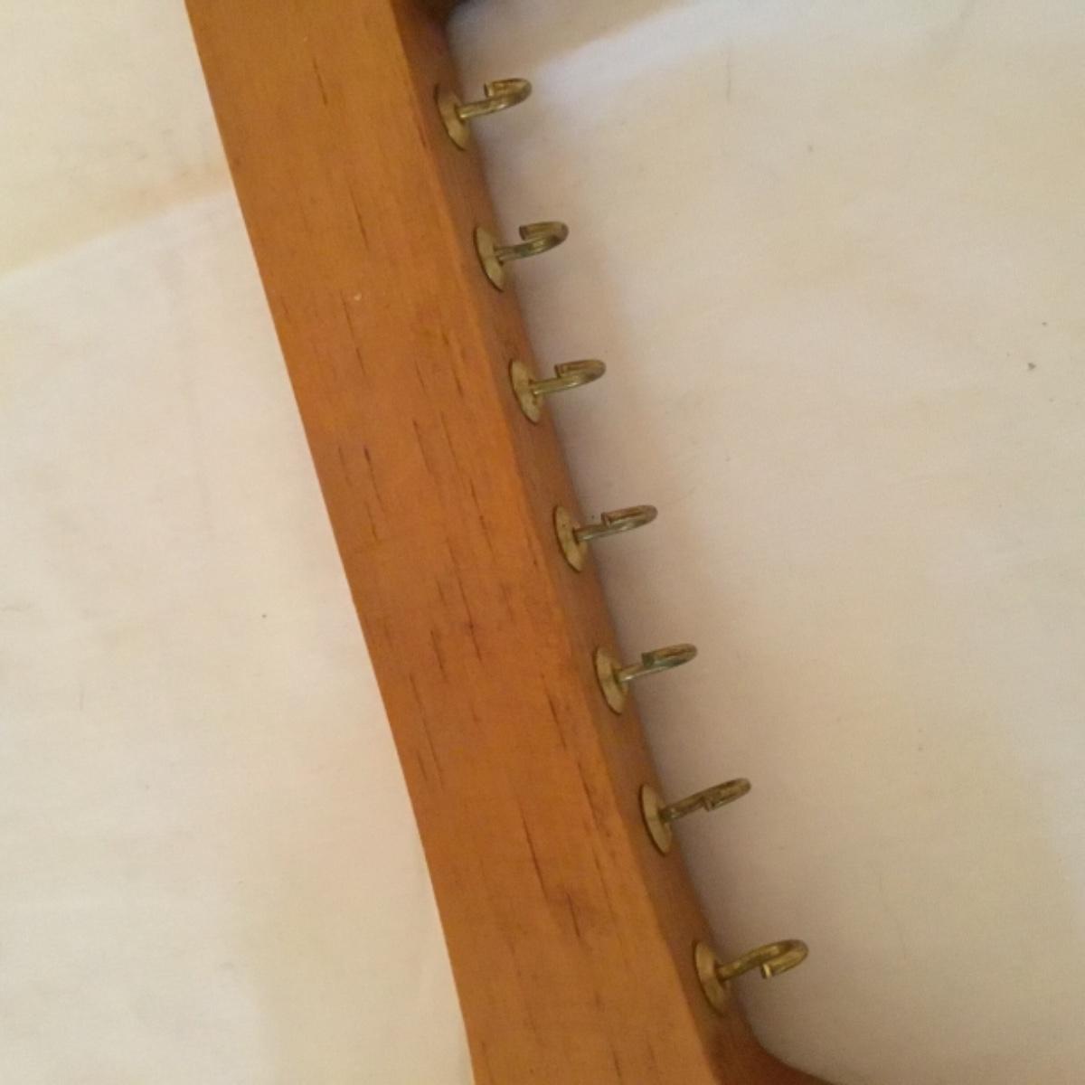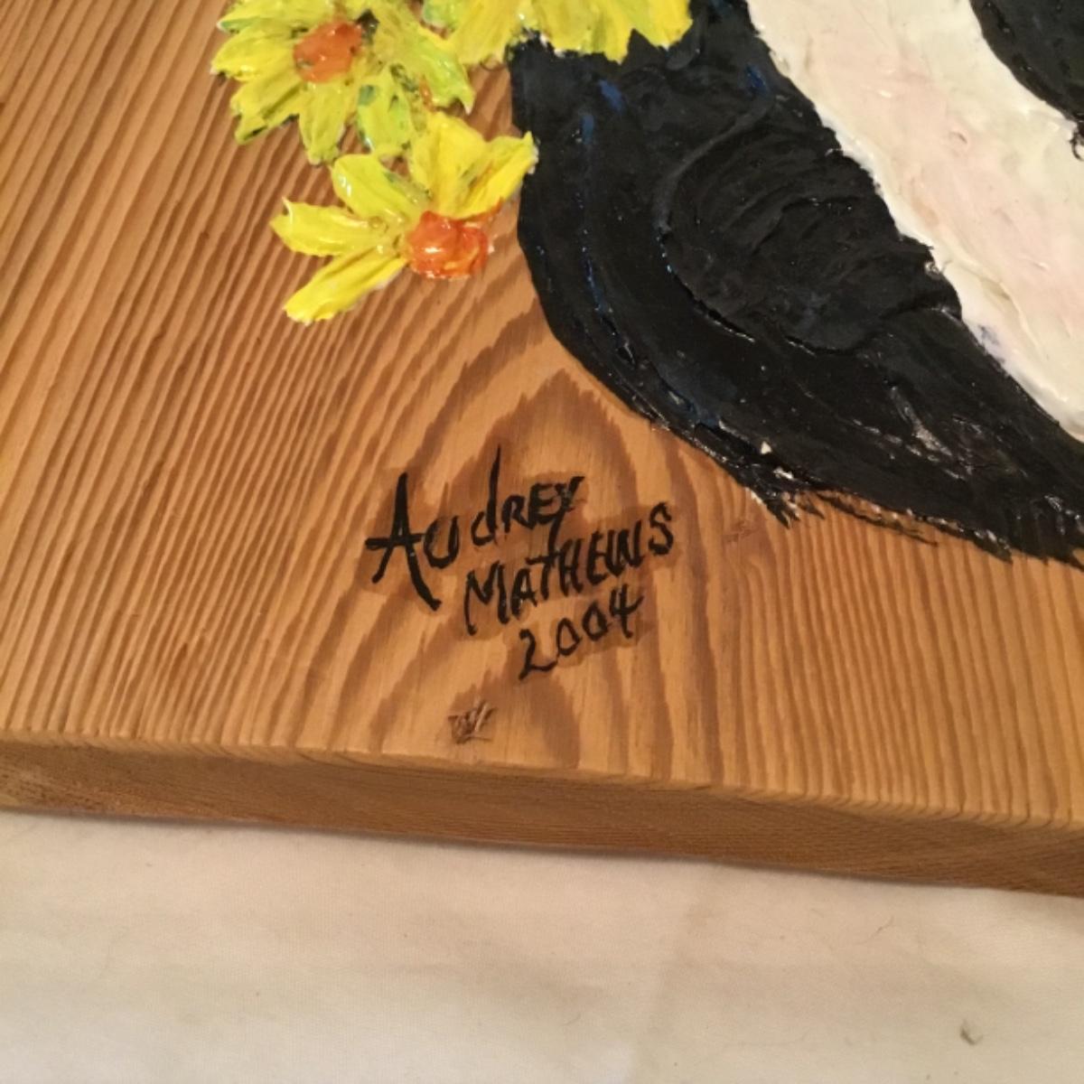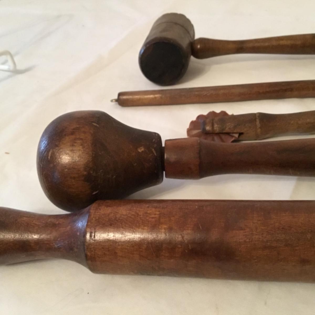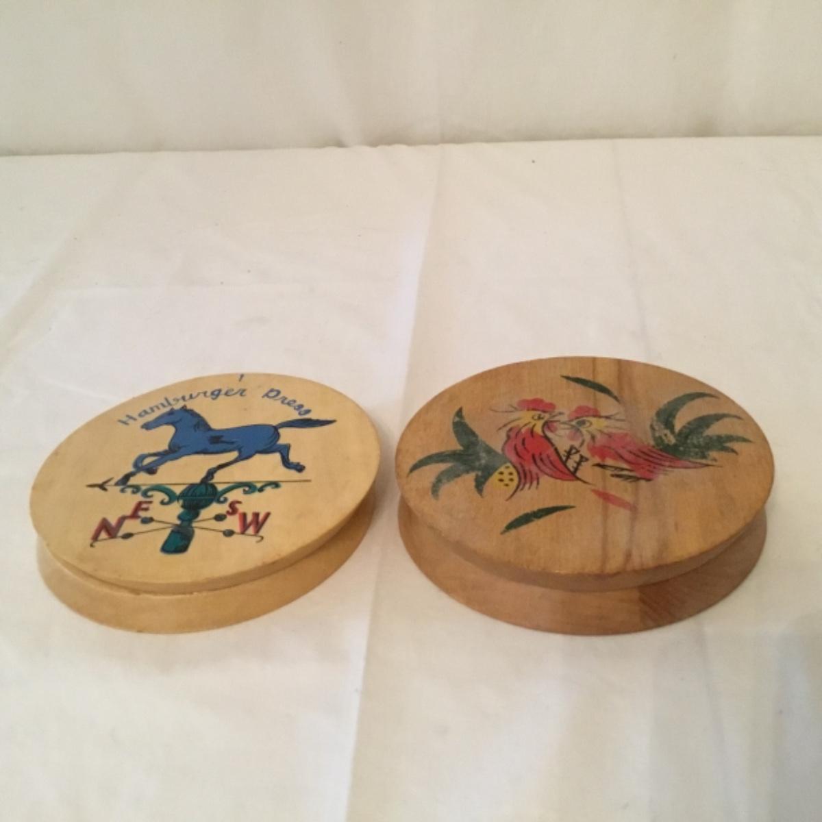 An adorable lot to keep your kitchen organized and decorated! Five wooden mountable hook organizers. There's a signed cow painting from a local Canton artist included. Painting measurements are 11”x15”. A wooden collapsable fruit basket that stands 13.5” tall and wooden utensils, see photos. A pair of wooden hamburger press, a wooden bowl, and a plate, along with a castiron and wooden clock can also be noted in this lot, see photos! Local pickup only.
