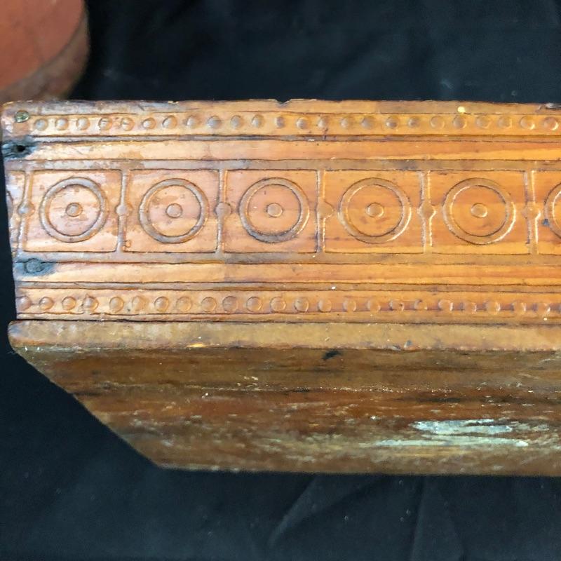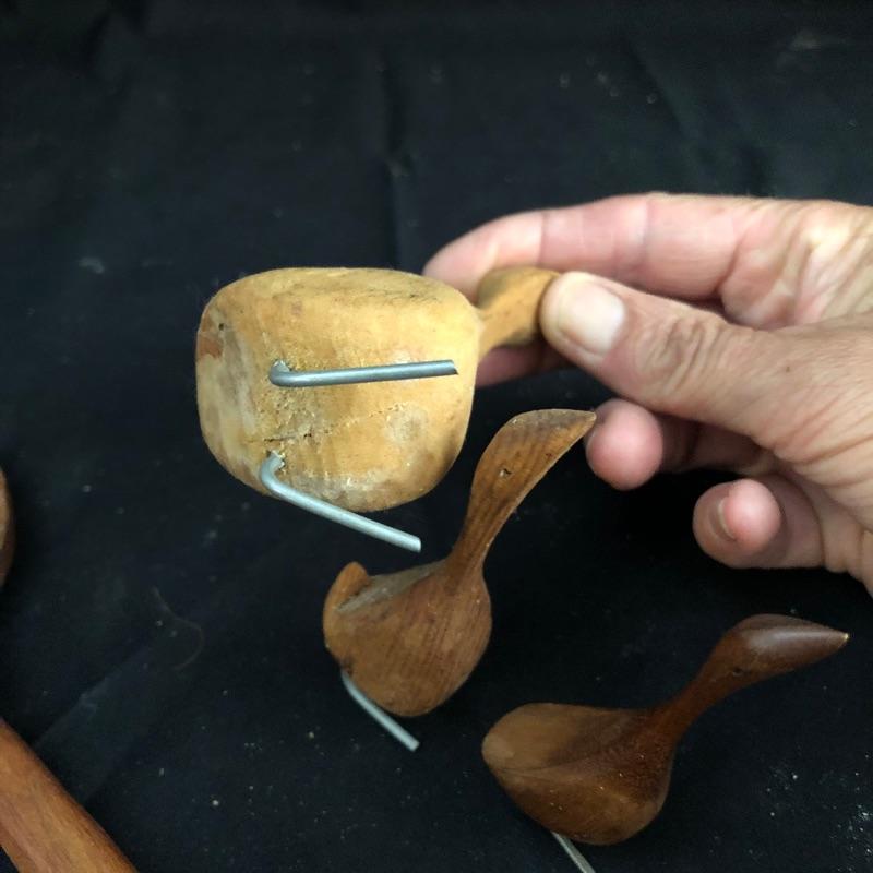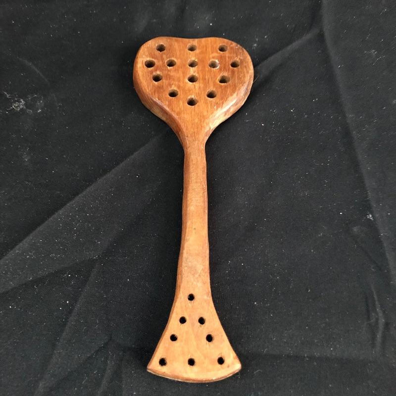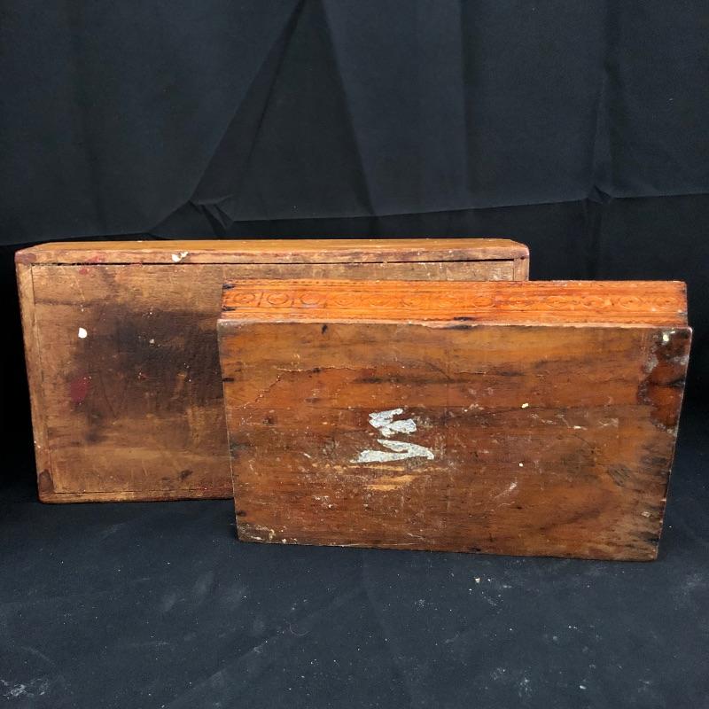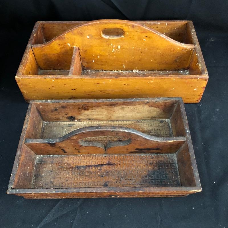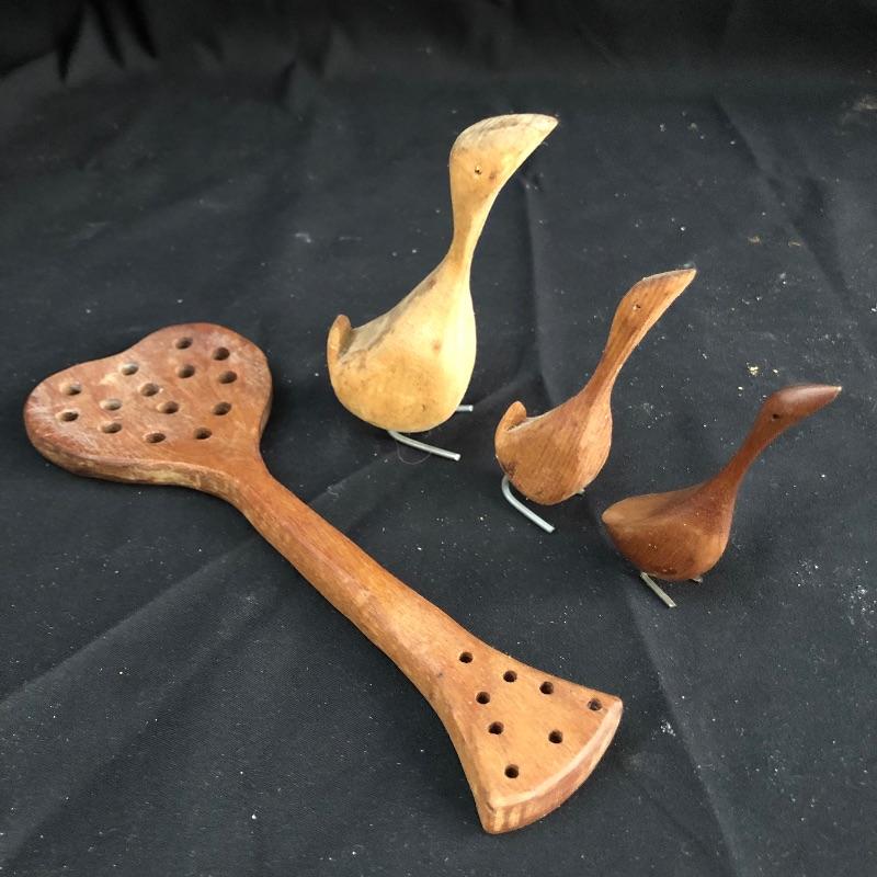 We have compiled a wonderful assortment of antique pieces here that are all made from wood. The lidded pail is in great condition and has some great features such as the wooden handle and copper studs. The larger pail appears to have had a red paint or stain originally; it is showing its age in places, but it all adds to its charm, see images. The smaller of the two trays has some lovely details, both need a clean up. The wooden spoon is very unique, not great for drinking soup, but it will make for a lovely display piece! Last but not least, 3 adorable wooden ducks with metal prong feet.