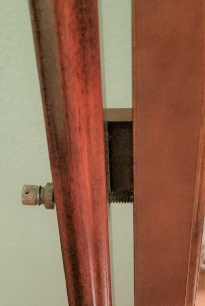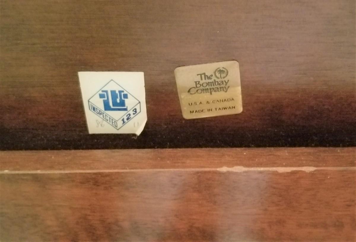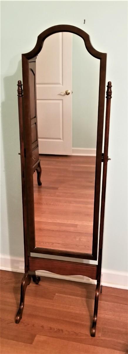 This Cheval mirror was made by the Bombay Company - 18" across at the base, 61.5" tall. There is a missing grommet that hides the interior screw on one side, but does not affect the structure, etc of the mirror. You have to look very closely to see it.