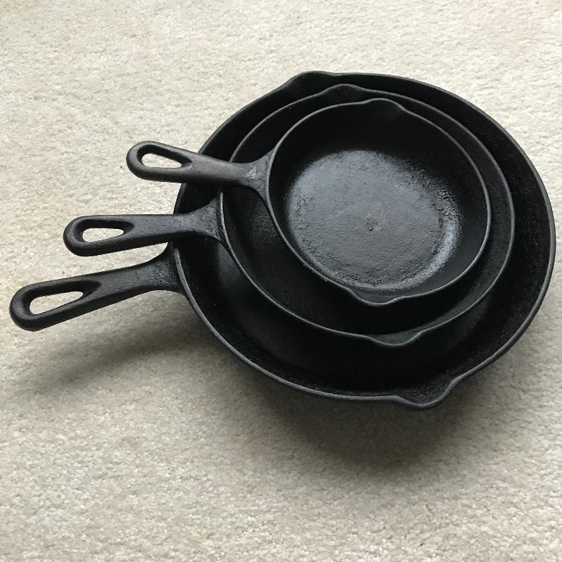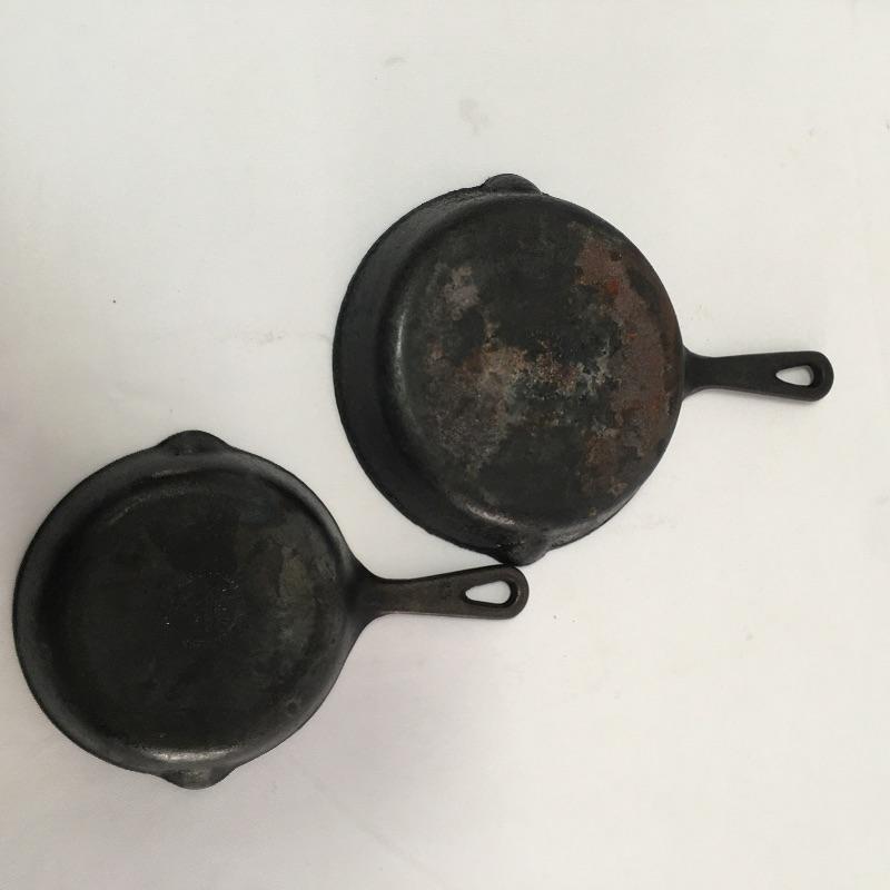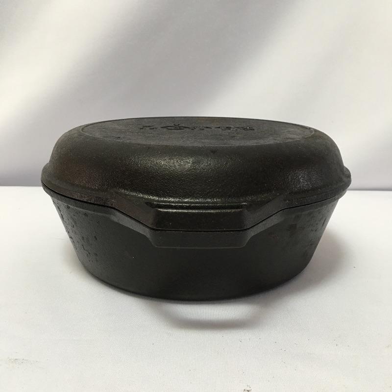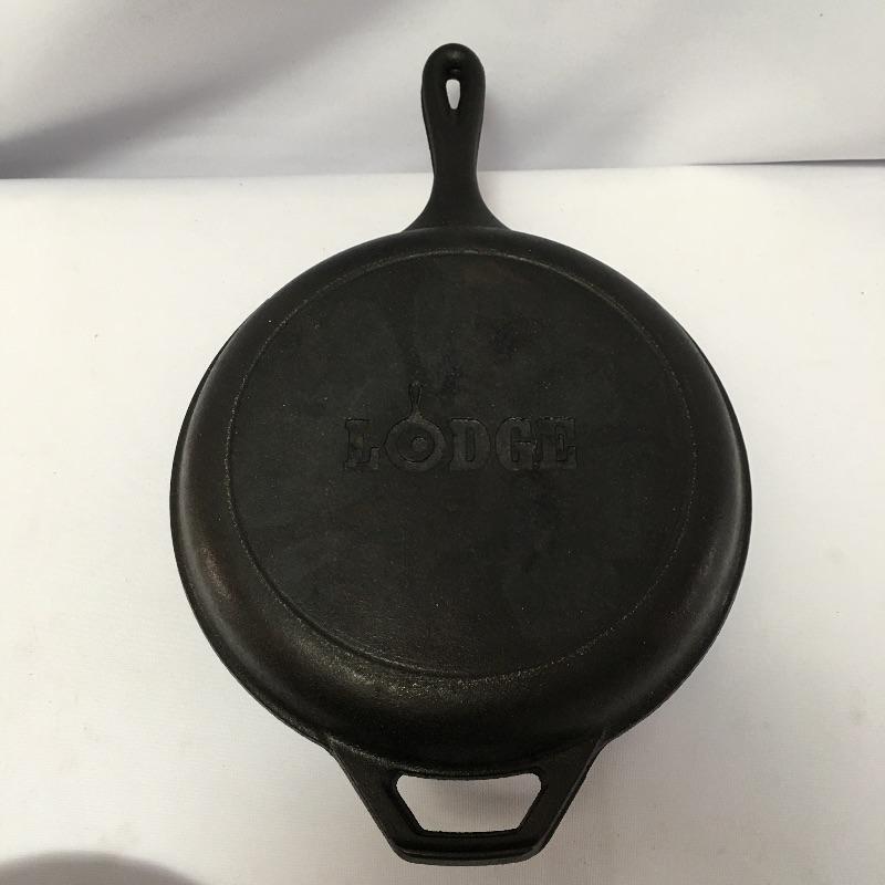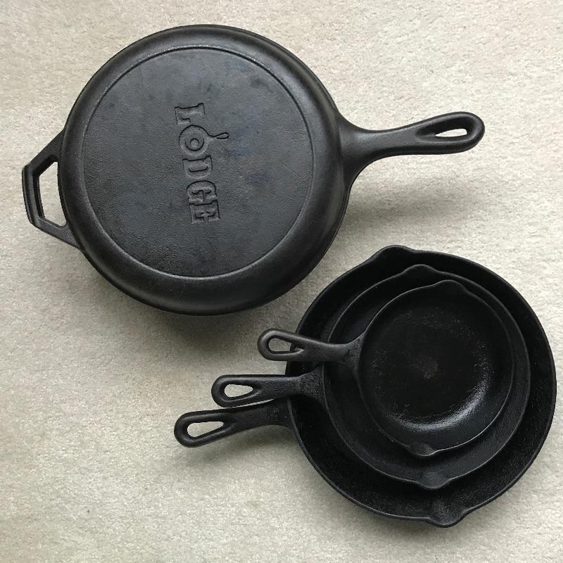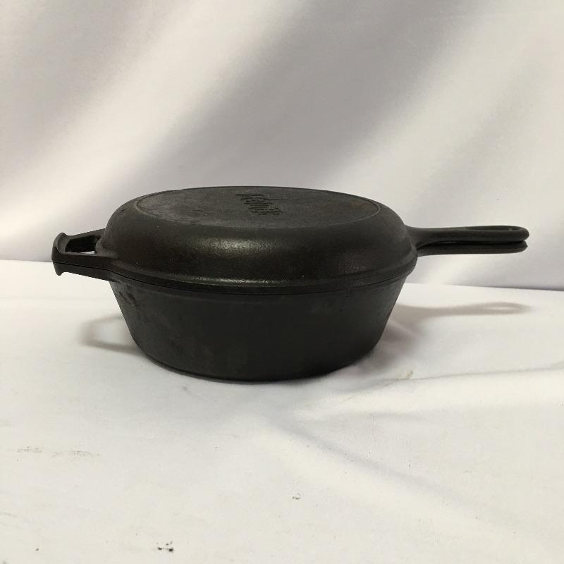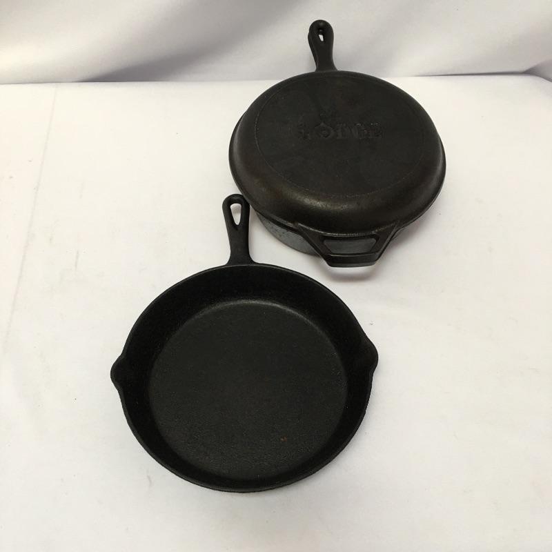 Lodge 3 quart cast iron combo cooker and a three piece fry pan set by Philipp Richard. The Lodge piece can be used as a Cast Iron Skillet, Fryer, Dutch Oven, and Convertible Skillet/Griddle Lid. Lodge set measures 10.5” x 17” x 5.25”. In 3piece set- Smallest fry pan is 7" d and largest is 11" d)
