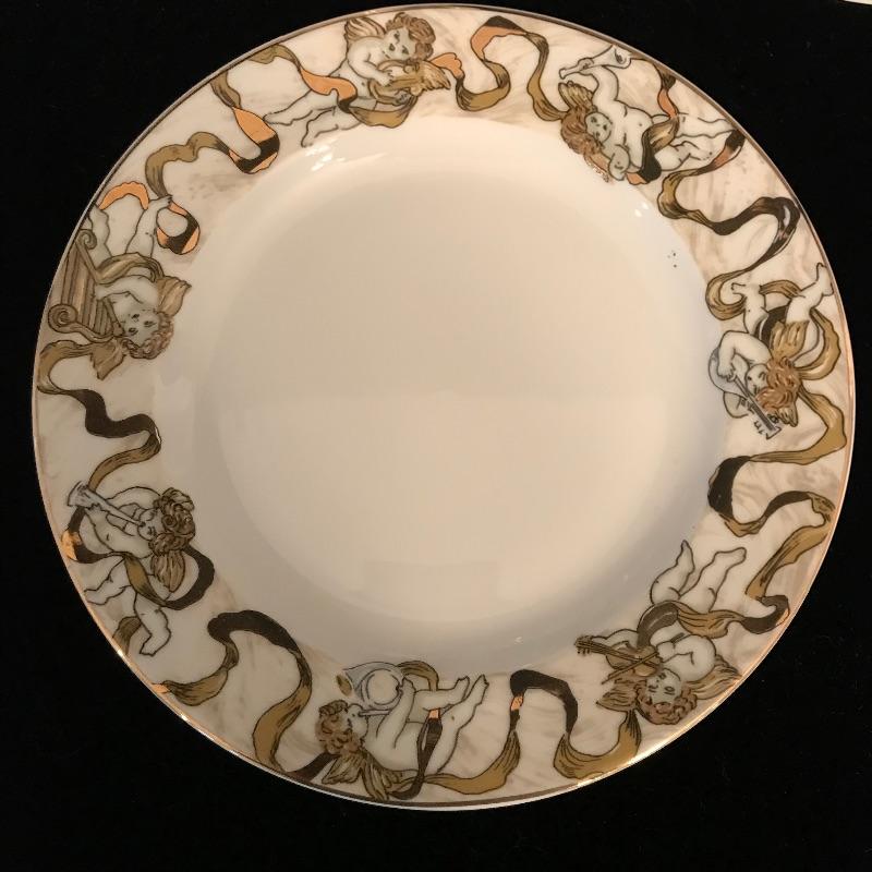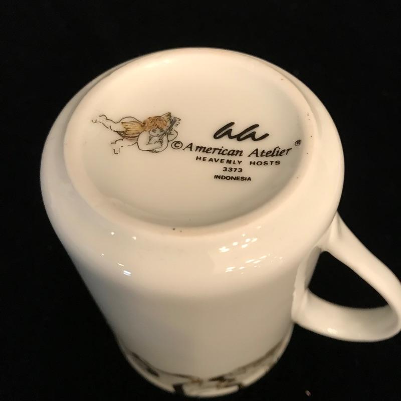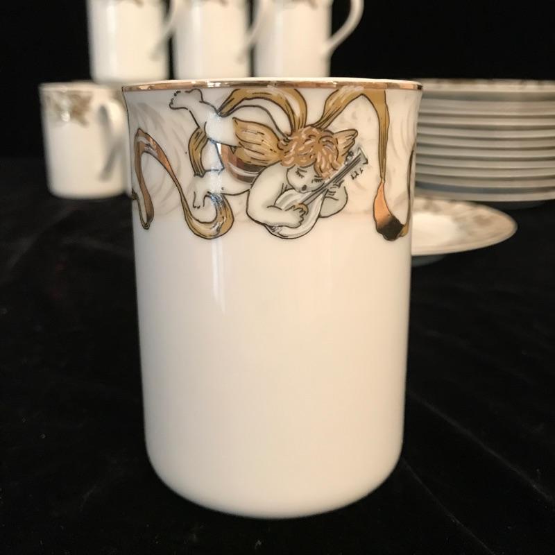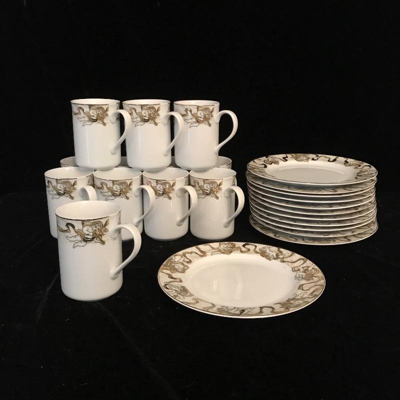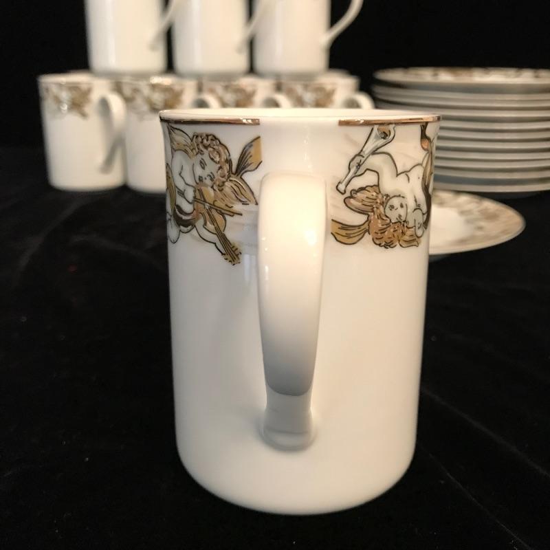 Twelve person gold accented “Heavenly Hosts” coffee and dessert set by American Atelier. This lot is in great condition. Each plate and cup has a nice gold rim and gold accents throughout. There are a couple areas of barely noticeable worn gold rim, one example is shown in photos. Plates measure 8”. Shipping available.
