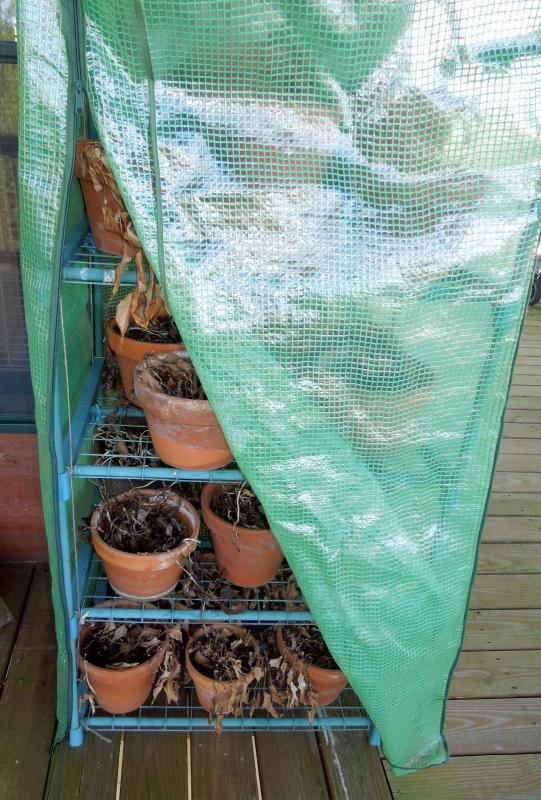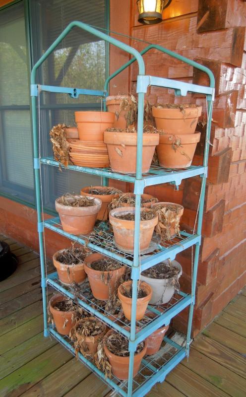 Removable zippered thick PVC cover over rolling metal frame arched garden cart. Cover protects plants during cold snaps or for germinating. 4 Shelves. Includes 18 terra cotta planters, 6 terra cotta saucers and two plastic saucers. No holes, rips or tears.