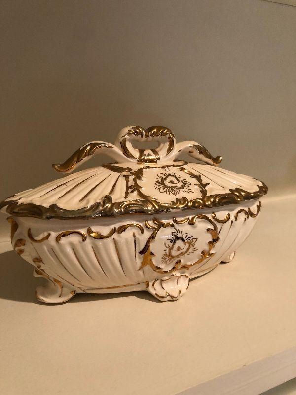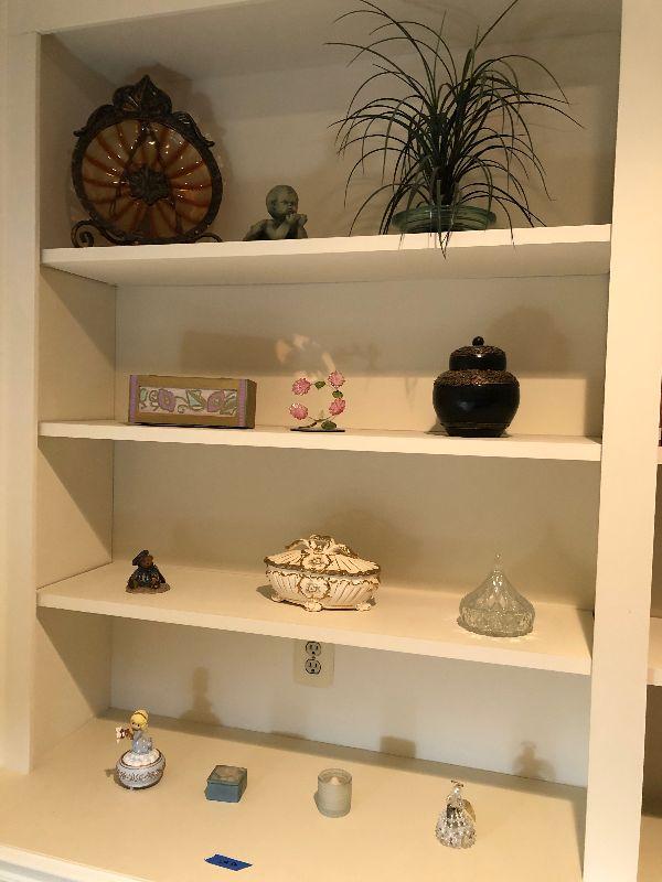 Decorative Accessories includes Faux Plant, Glass Plate, Angel Statue, Boyd's Bear, Vintage China Bowl w/Lid, Crystal Candy Jar, Precious Moments Music Box and More.