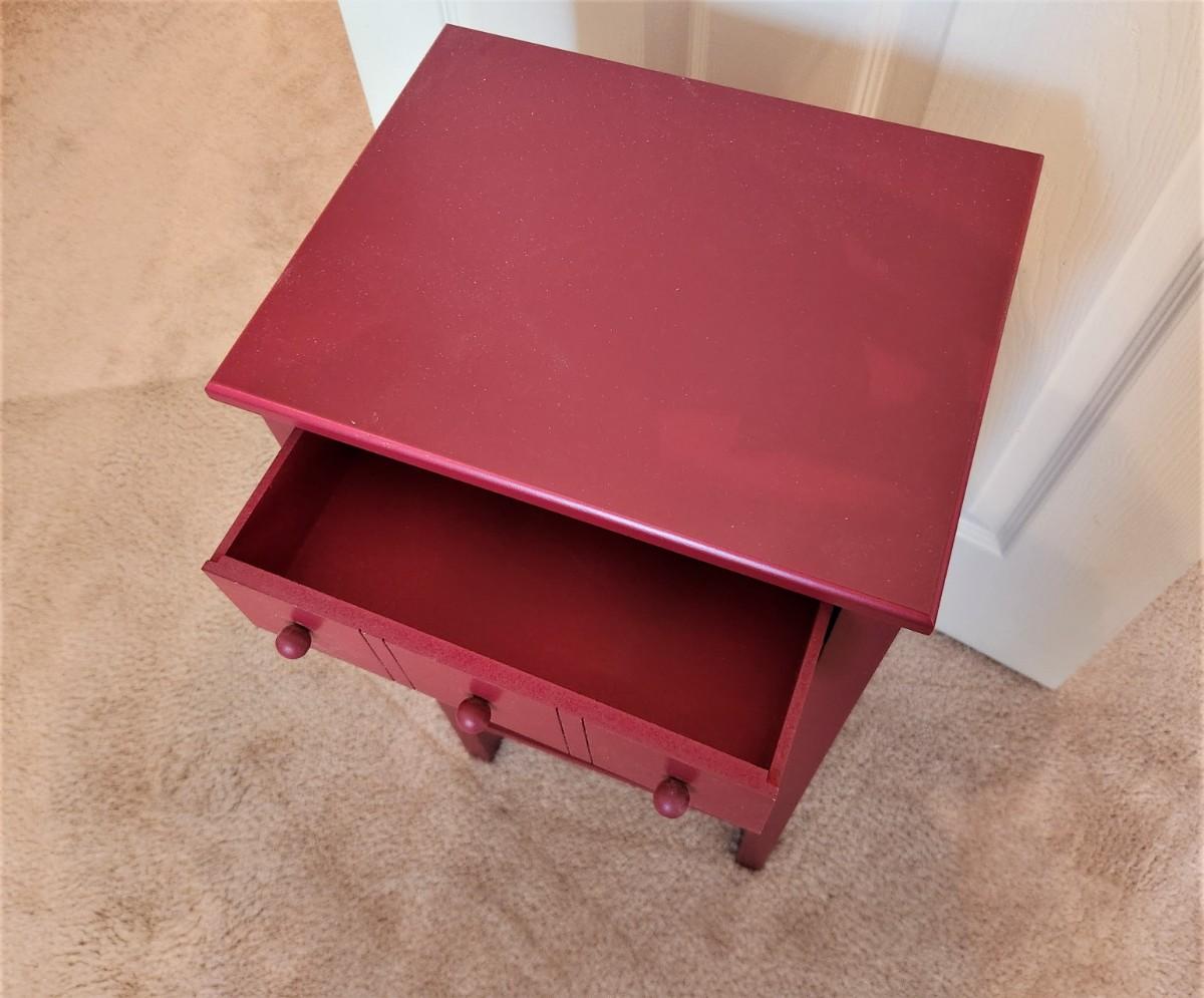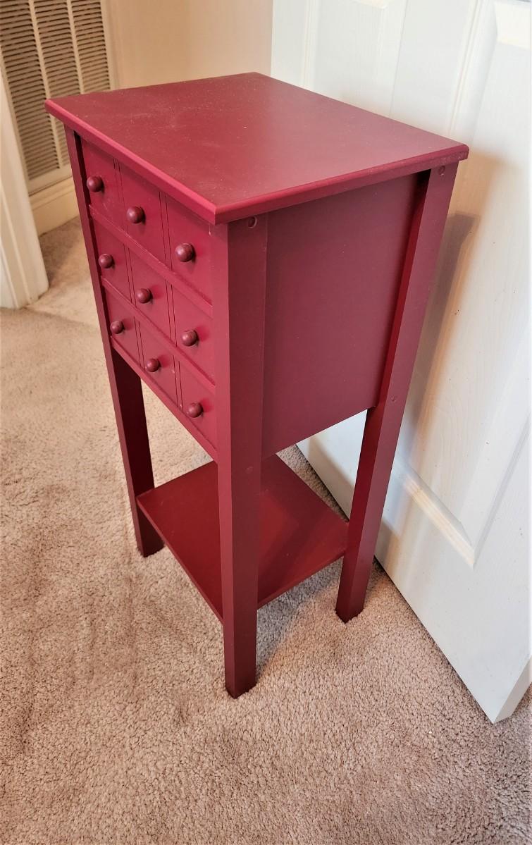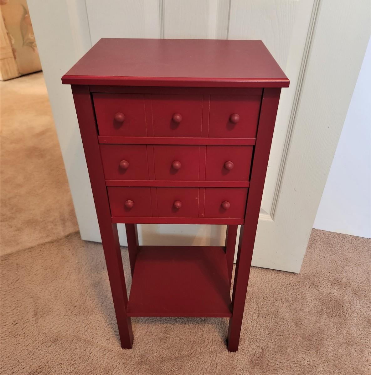 Cute decorator side cabinet - brick red - 3 drawer. Good condition. Top is 12.5" x 10", 28" tall.