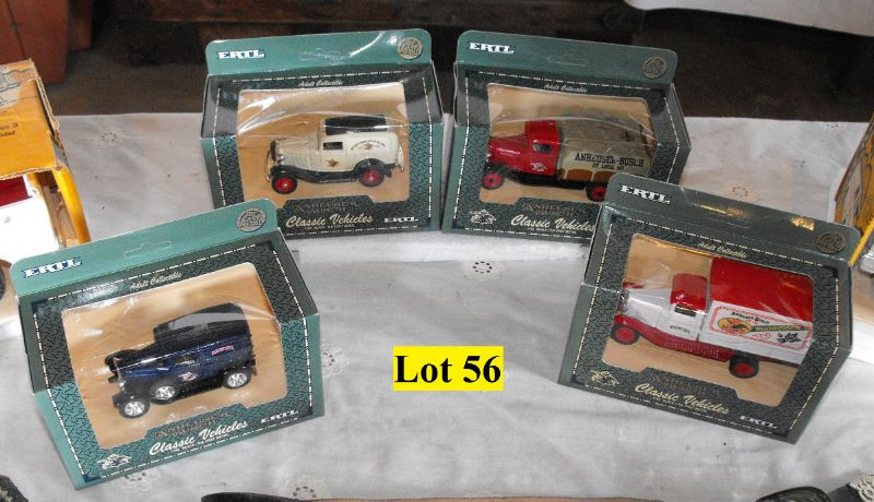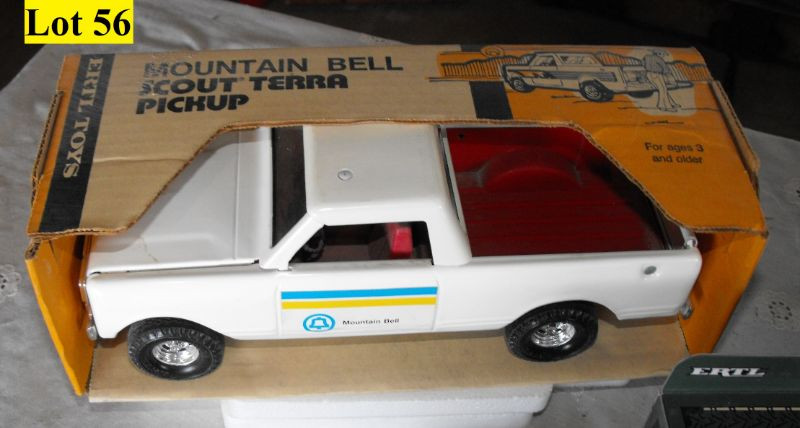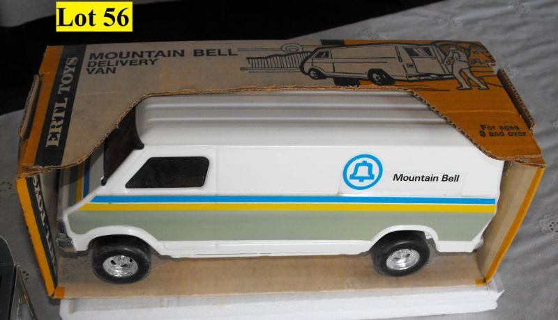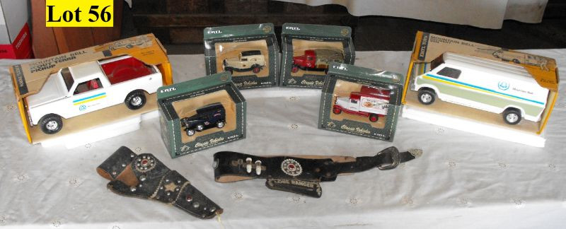 Vintage “Mountain Bell” Van and Truck in Box, 4 Anheuser Busch Die Cast Classic Vehicles, “Lone Ranger” Toy Leather Holster and Belt (Fair Condition)