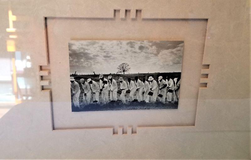 Framed black/white photograph of prisoners working in the field at Angola penitentiary. Custom framing. A powerful image. Measures 19" x 16".